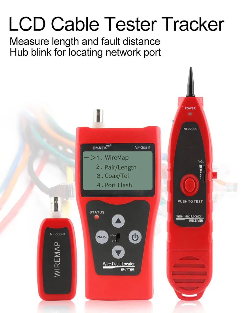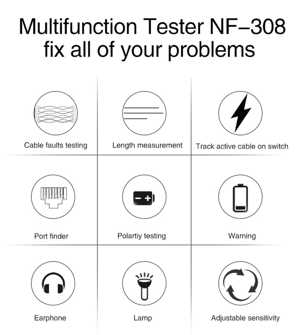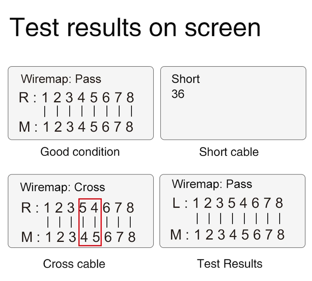2. Testez l'état de connexion deCâble RJ11, RJ45, BNC, Tels queCircuit ouvert, court-circuit, crossover,Connexion inverse, et emplacement de déconnexion du câble, et affichage intuitif sur l'écran LCD.