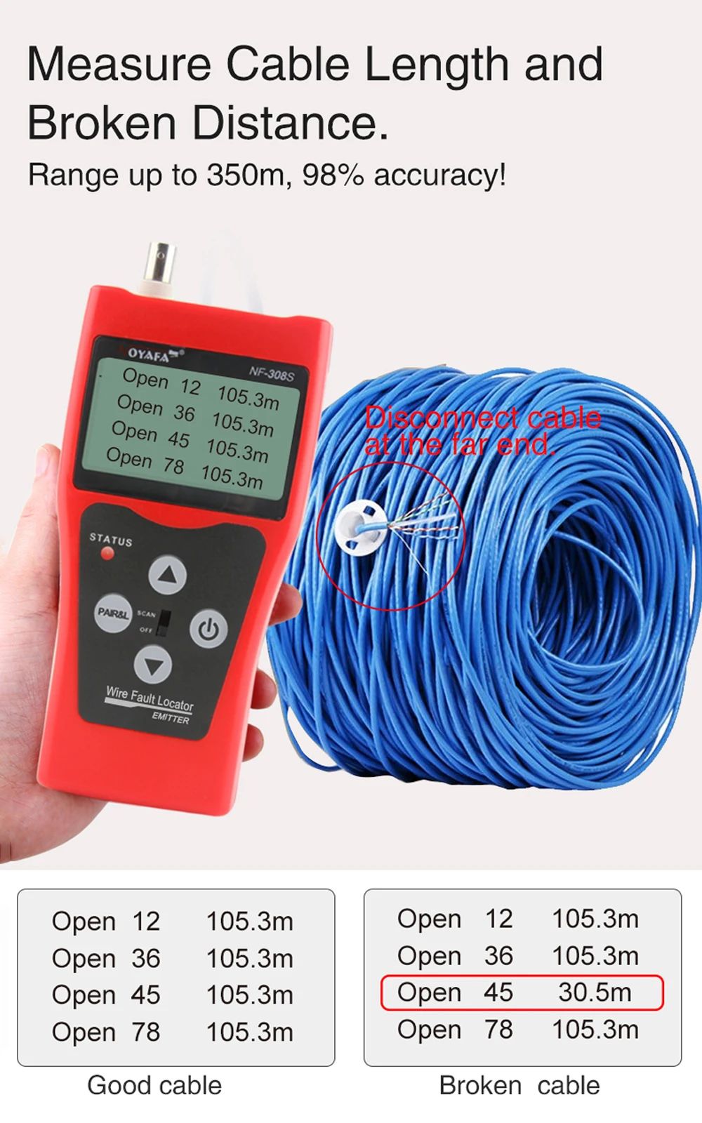 4. La longueur du câble peut être mesurée jusqu'à 350 mètres, Et l'exactitude de mesurer la longueur du câble et de localiser le fil cassé est jusqu'à 98%.
