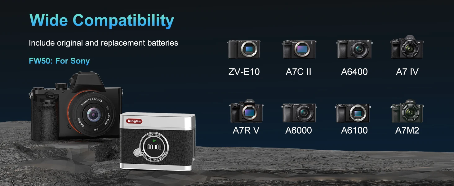 Diseñado para mejorar su fotografía, este cargador de batería dual NP-FW50 es compatible con una amplia gama de cámaras Sony.La lista completa incluye: Serie Alpha α: A3000, A5000, A5100, A6000, A6100, A6300, A6400, A6500;Serie ZV: ZV-E10;Serie A7: A7, A7 II, A7R, A7R II, A7S, A7S II;Serie RX: RX10, RX10 II, RX10 III, RX10 IV;Serie NEX: NEX-3, NEX-3N, NEX-5, NEX-5C, NEX-5N, NEX-5R, NEX-5T, NEX-6, NEX-7, NEX-C3, NEX-F3;y serie SLT: SLT-A33, A35, A37, A55.