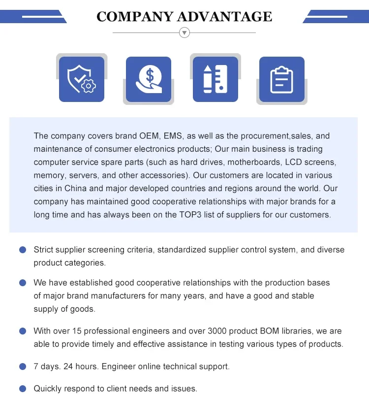 1. ¿Quiénes somos?Nuestra sede está ubicada en Guangdong, China.Desde 2013, hemos vendido a Sudamérica (30,00%), Europa del Este (20,00%), Europa del Sur (15,00%), Sudeste Asiático (10,00%), Europa Occidental (10,00%), mercado nacional (5,00%), América Central (5,00%) y Europa del Norte (5,00%).Contamos con un total de aproximadamente 11 a 50 personas en nuestra oficina.2.¿Cómo garantizamos la calidad?Antes de la producción en masa, siempre es una muestra antes de la producción; Realice siempre una inspección final antes del envío;3.¿Qué puedes comprarnos?Base de expansión y pantalla dual.4.¿Por qué desea comprarnos a nosotros en lugar de a otros proveedores?FKA es un proveedor profesional de comercio de piezas, que se centra principalmente en piezas de computadoras, servidores y componentes de estaciones de trabajo.Los servicios de integridad, la calidad, la innovación incomparables y el compromiso con la mejora continua son lo que brinda FKA Electronics.5.¿Qué servicios podemos ofrecer?Condiciones de entrega aceptables: FOB, EXW; Monedas de pago aceptables: dólares estadounidenses, euros, dólares de Hong Kong, libras británicas, yuanes chinos; Métodos de pago aceptados: Transferencia bancaria, AliExpress, tarjeta de crédito, PayPal, Western Union, efectivo, depósito de garantía; Inglés hablado: inglés, chino, español, japonés, portugués, alemán, árabe, francés, ruso, coreano, italiano.