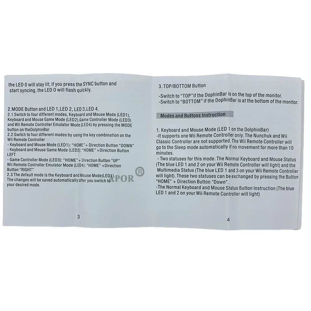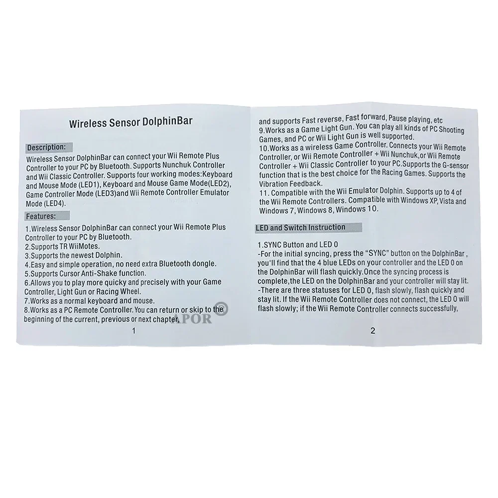 Modo teclado y ratón (LED1),Modo de juego de teclado y ratón (LED2)Modo controlador de juego (LED3)Para modo emulador de control remoto Wii (LED4)Características:1.El sensor inalámbrico Dolphinbar puede conectar el controlador Wii Remote Plus a su PC mediante Bluetooth2.Soporta motores TR -Wii3.Apoya el Dolphin más nuevo4.Operación fácil y sencilla, no necesita un dongle Bluetooth adicional5.Admite la función Cursor Anti-vibración6.Te permite jugar de forma más rápida y precisa con tu controlador de juego, pistola de luz o rueda de carreras.7.Funciona como un teclado y un mouse normales.8.Funciona como control remoto de PC.Puedes regresar o saltar al comienzo del capítulo actual, anterior o siguiente.y admite marcha atrás rápida, avance rápido, reproducción de pausa, etc.9.Funciona como una pistola de luz de juego.Puedes jugar todo tipo de juegos de disparos para PC, y PC o Wii Light Gun es bien compatible10.Funciona como un controlador de juego inalámbrico que se conecta para el control remoto Wii o el control remoto Wii El control remoto Wii Nunchuk Wii Classic Controller a su PC Admite la función de sensor G que es la mejor opción para los juegos de carreras.Apoya la retroalimentación de vibración11.Compatible con Wii Emulator Dolphin Admite hasta 4 de los controladores remotos de Wii.Compatible con Windows XP, Vista y Windows 7.Windows 8.LED de Windows 10 e instrucciones de interruptorBotón SYNC y LED OPara la sincronización inicial, presione el botón "SYNC" en la barra Dolphin, encontrará que los 4 LED azules de su controlador y el LED O del Dolphinbar parpadearán rápidamente.Una vez completado el proceso de sincronización, el LED del Dolphinbar y su controlador permanecerán encendidosHay tres estados para LED 0. Parpadea lentamente, parpadea rápidamente y permanece encendido.(Si el control remoto Wii no se conecta, el LED O parpadeará lentamente; si el control remoto Wii se conecta correctamente, el LED permanecerá encendido; si presiona el botón SYNC y comienza a sincronizar, el LED O parpadeará rápidamente.