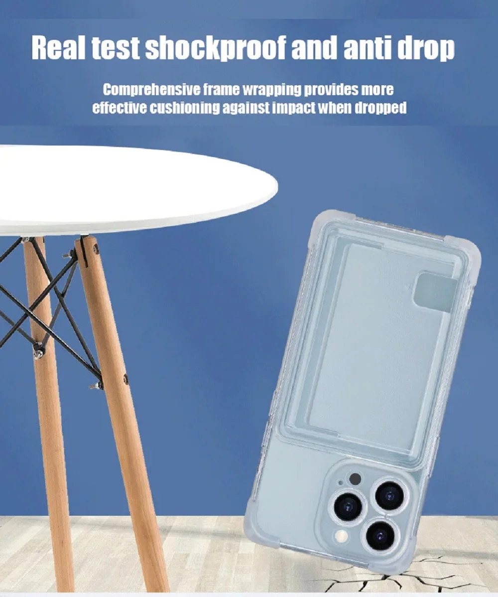 Características: parte trasera transparente + bolsa para tarjetas + a prueba de golpes