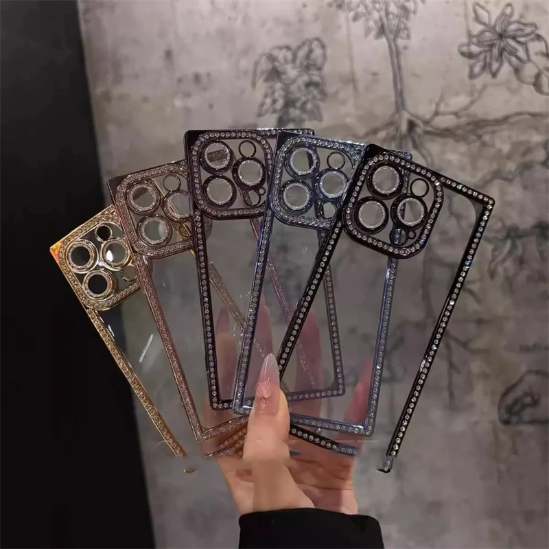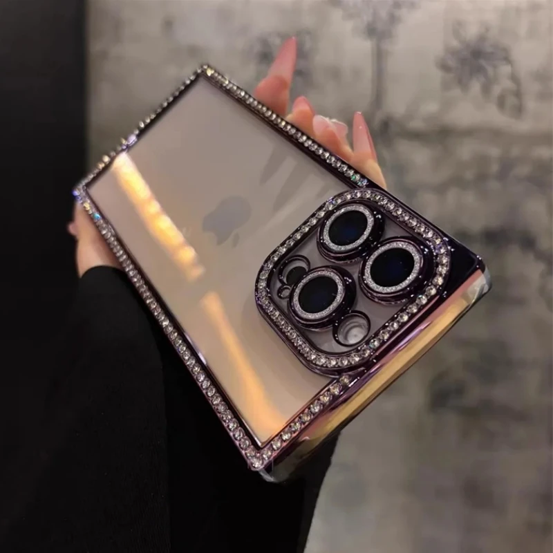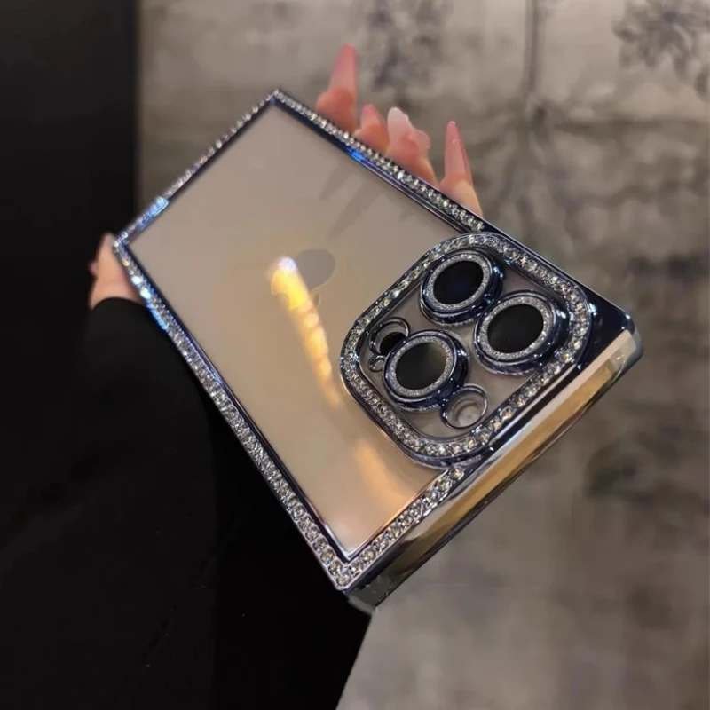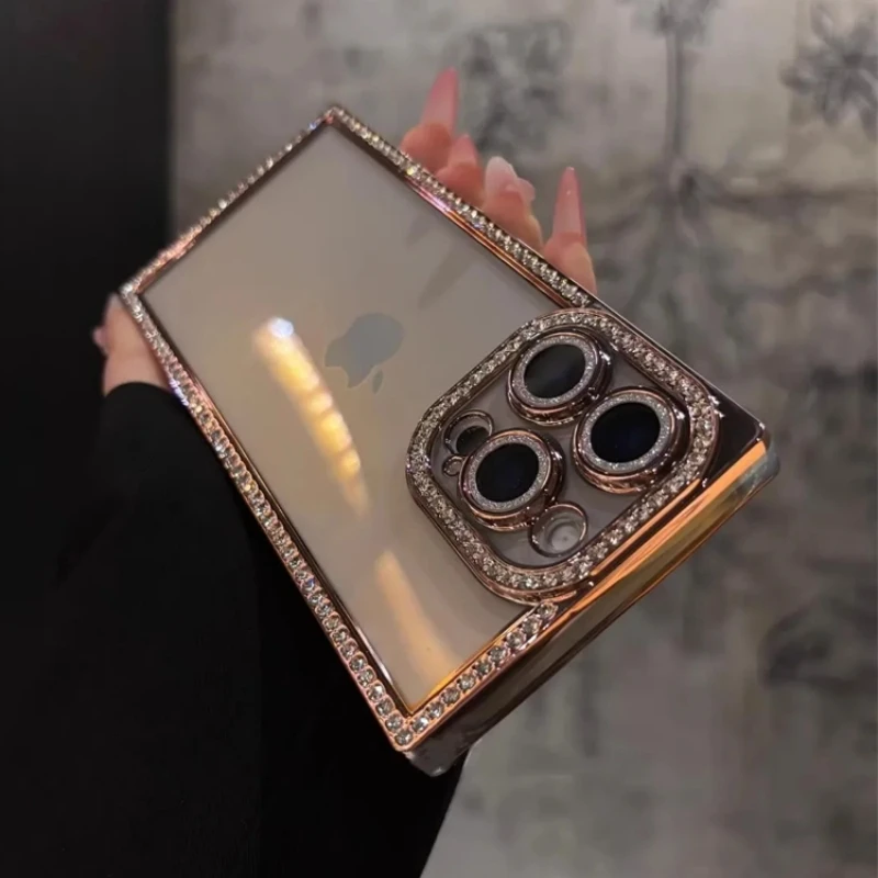 New Fashion Glitter Diamond Transparent Case For iPhone 16 15 14 13 Pro Max 16 Luxury Square Plating Soft Silicone Bumper Cover