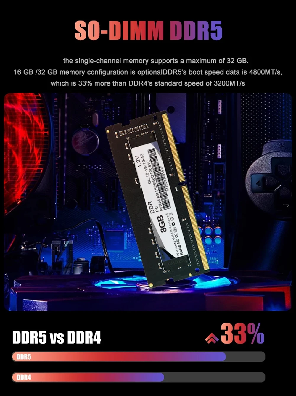 -1 ranura de RAM SODIMM DDR5, compatible con un máximo de 32 GB y 4800 MHz.