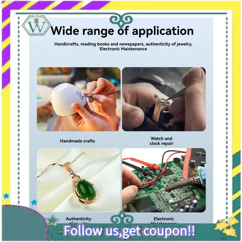 Ampliación del producto: 2X, 6X, 8X, 10X, 12X, 24X Fuente de luz del producto: 2 luces LED Método de alimentación: 4 pilas de botón CR1620 (incluidas)