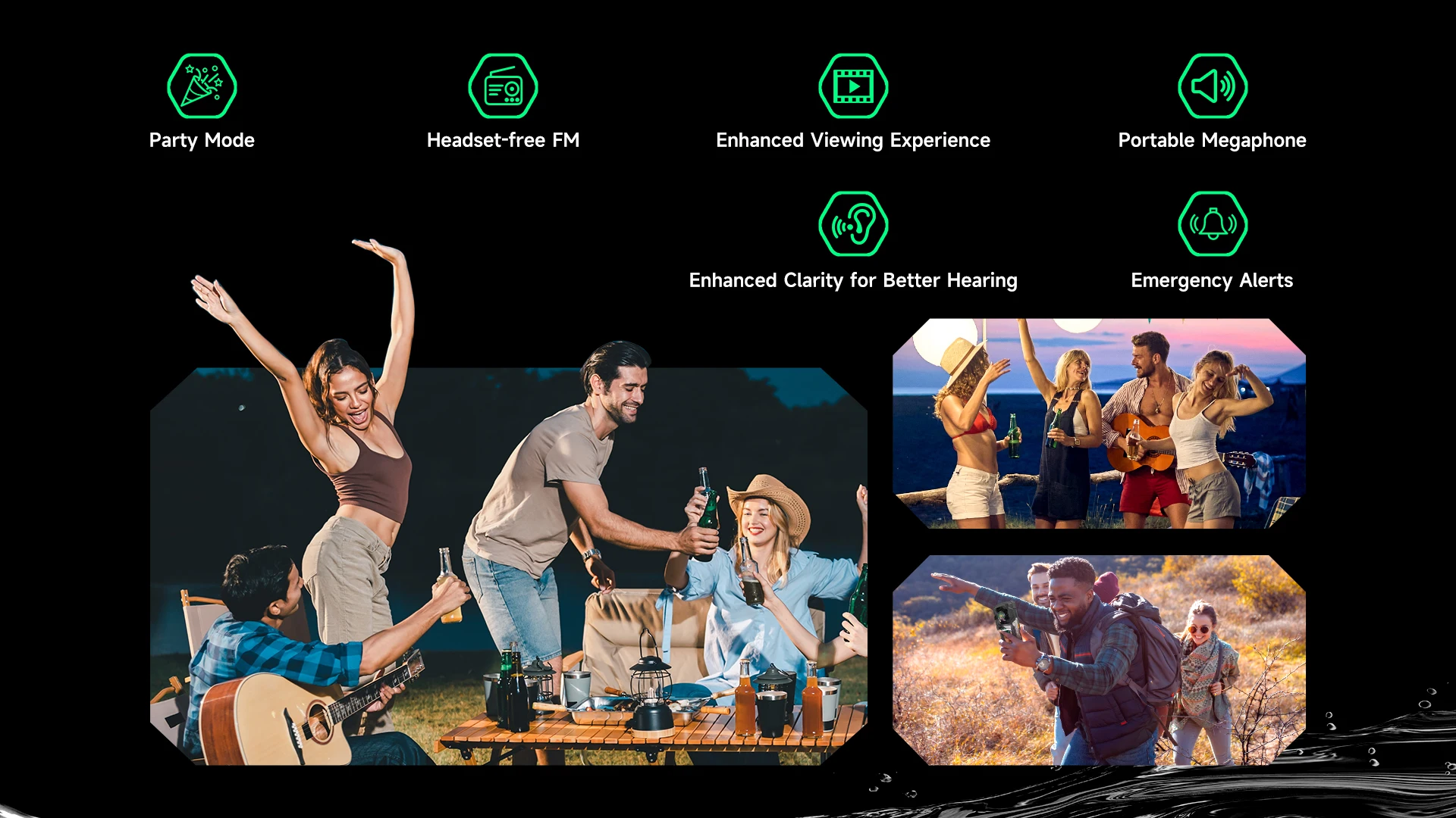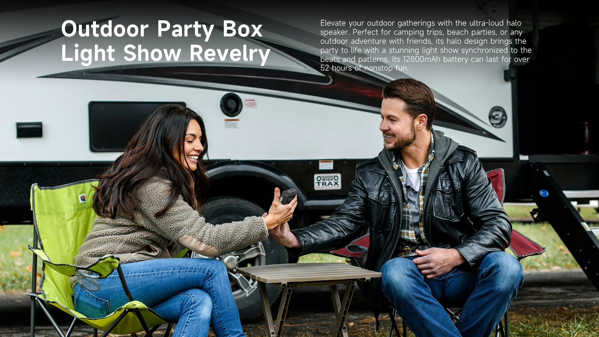Mejora tus reuniones al aire libre con el altavoz halo ultra fuerte.Perfecto para viajes de campamento, fiestas en la playa o cualquier aventura al aire libre con amigos, su diseño de halo da vida a la fiesta con un impresionante espectáculo de luces sincronizado con los ritmos y patrones.Su batería de 12800 mAh puede durar más de 52 horas de diversión sin parar.