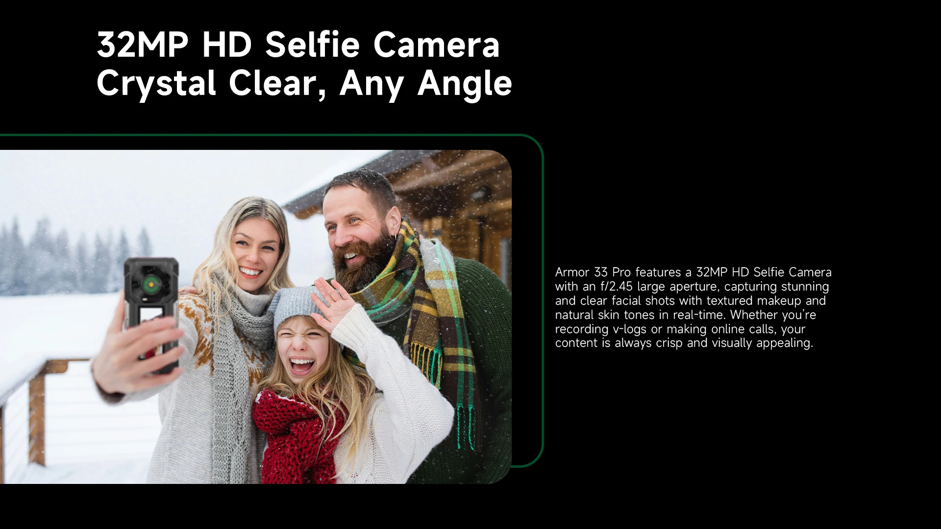 Armor 33 Pro cuenta con una cámara Selfie HD de 32 MP con una gran apertura f/2,45, que captura fotografías faciales impresionantes y claras con maquillaje texturizado y tonos de piel naturales en tiempo real.Ya sea que esté grabando v-logs o realizando llamadas en línea, su contenido siempre es nítido y visualmente atractivo.