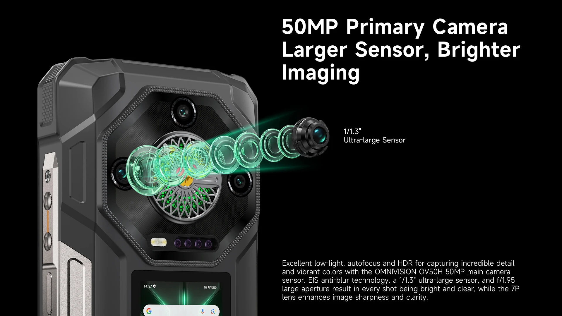 Excelente lectura de poca luz, enfoque automático y HDR para capturar detalles increíbles y colores vibrantes con el sensor de cámara principal OMNIVISION OV50H de 50 MP.La tecnología anti-flor EIS, un sensor ultragrande de 1/1,3" y una gran apertura de f/1,95 hacen que cada toma sea brillante y clara, mientras que la lente 7P mejora la nitidez y claridad de la imagen.
