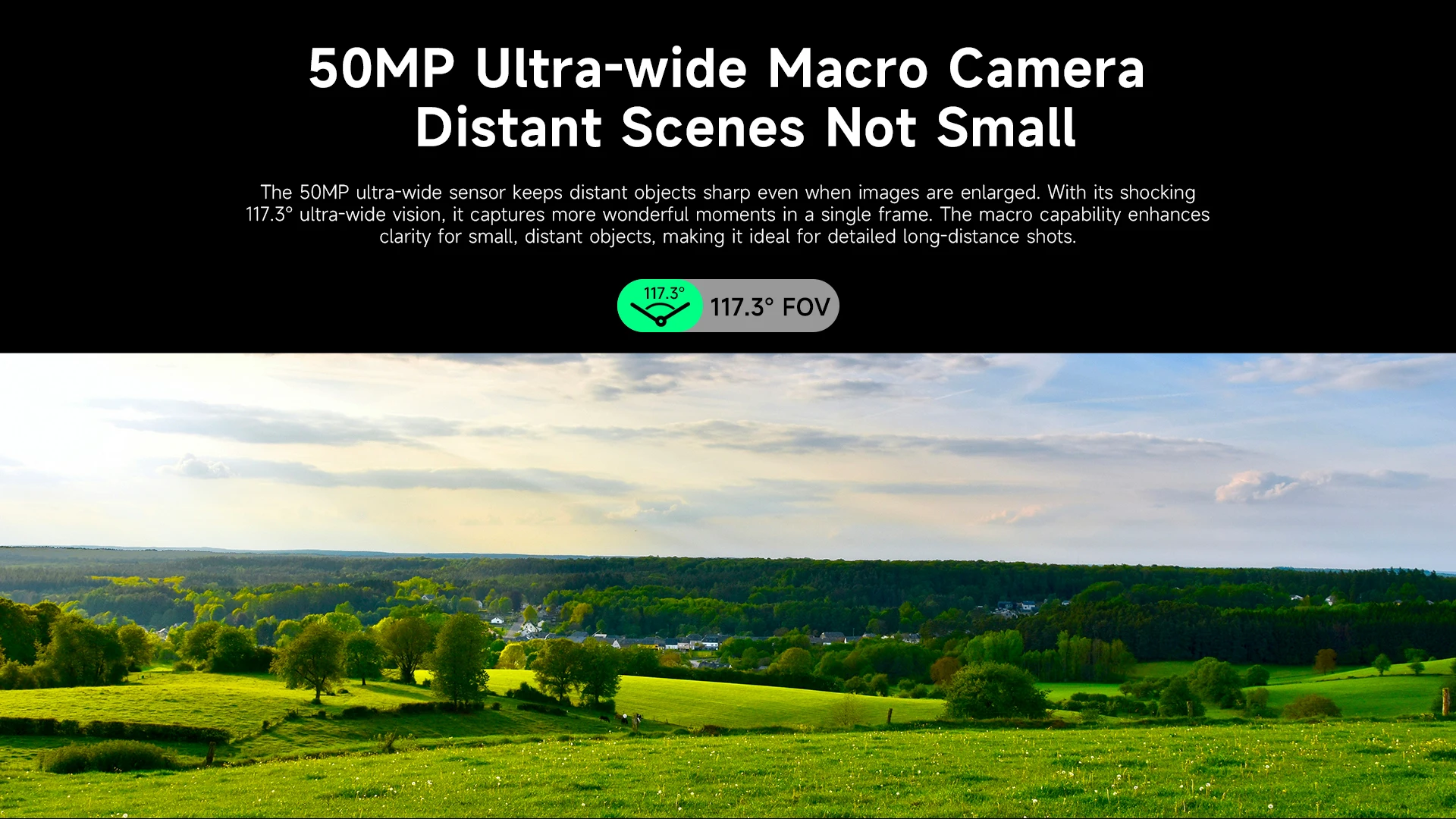 El sensor ultra ancho de 50 MP mantiene los objetos distantes nítidos incluso cuando las imágenes están ampliadas.Con su impactante 117.3° Con visión ultra amplia, captura momentos más maravillosos en un solo fotograma.La capacidad macro mejora la claridad de objetos pequeños y distantes, lo que la hace ideal para tomas detalladas de larga distancia.