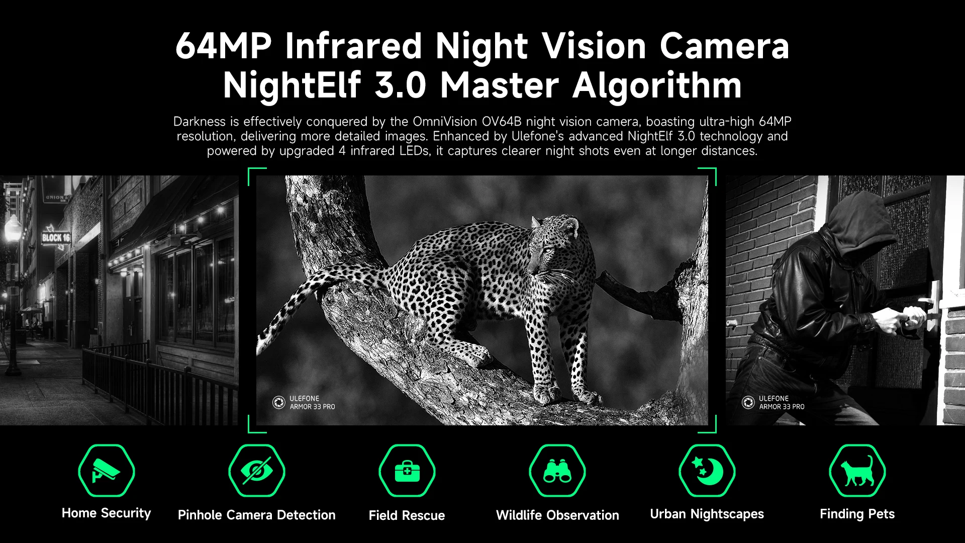 La oscuridad es conquistada de manera efectiva por la cámara de visión nocturna OmniVision OV64B, que cuenta con una resolución ultra alta de 64 MP y ofrece imágenes más detalladas.Mejorado por la avanzada tecnología NightElf 3.0 de Ulefone y alimentado por 4 LED infrarrojos mejorados, captura fotografías nocturnas más claras incluso a distancias más largas.