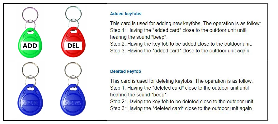YPuedes abrir la puerta con la tarjeta de acceso RFID desde afuera.Esta cámaraAdmite 500 tarjetas de usuario.Programaremos el RFID para usted antes del envío, y si desea agregar o eliminar claves, puede hacerlo como se muestra en la siguiente imagen: