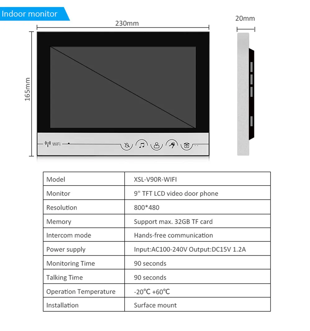 La unidad exterior está equipada con cámara 700TVL, panel de aleación de aluminio de hierro fundido y cubierta impermeable.El monitor interior tiene una pantalla LCD a color de 9" y el color blanco luce más moderno.