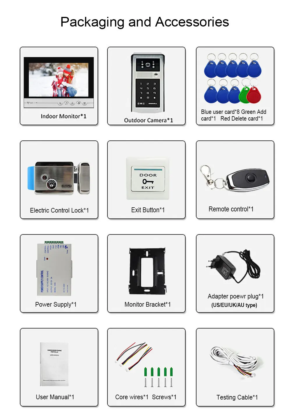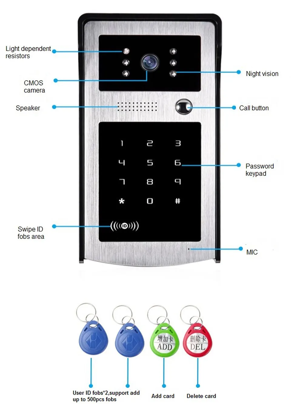 Este es un kit de intercomunicación con timbre con vídeo de 700 TVL.Las luces LED incorporadas mejoran la vista nocturna y la cubierta impermeable le proporciona una buena protección.La unidad exterior RFID admite un máximo de 500 llaves RFID.Viene con 2 tarjetas de gestión para agregar/eliminar claves.La frecuencia del lector RFID es de 125 KHZ.