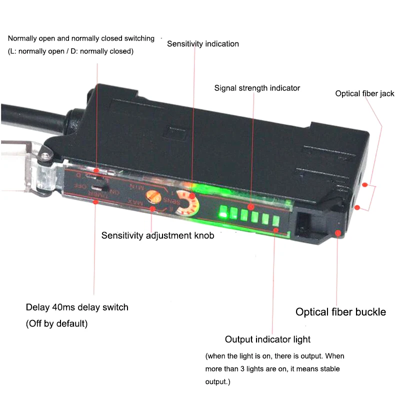 Sensitivity adjustment knob: large clockwise and small counterclockwise. After the position of the optical fiber and the measured object is fixed, rotate slowly until the signal indicator lights up more than 4 times.