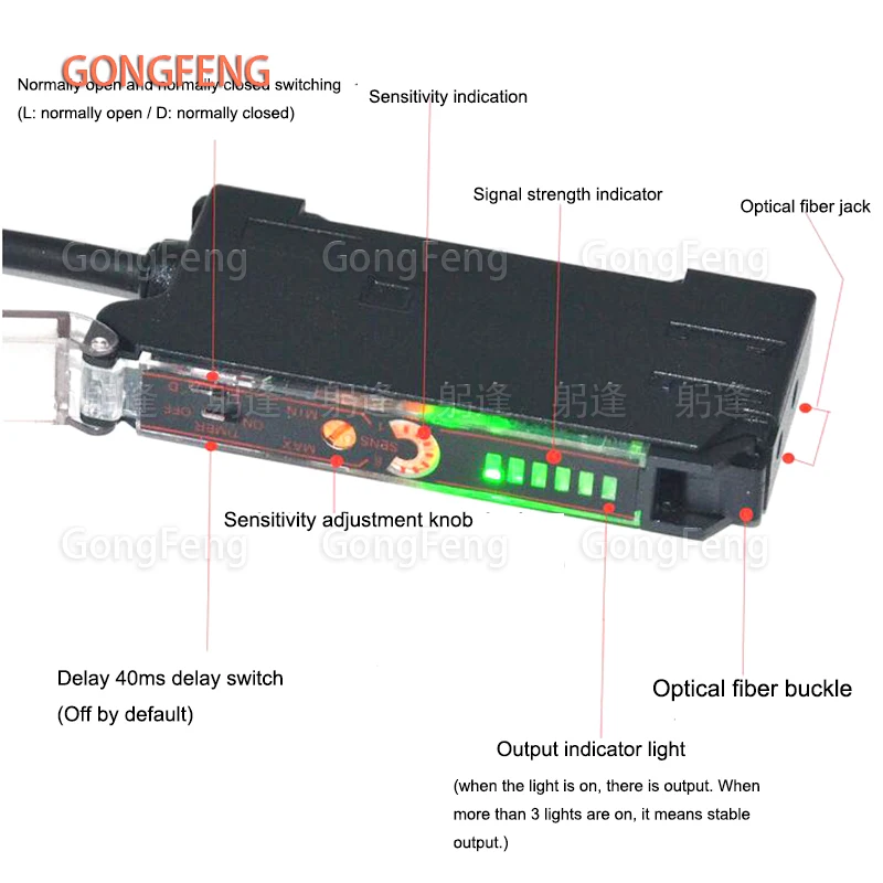 Sensitivity adjustment knob: large clockwise and small counterclockwise. After the position of the optical fiber and the measured object is fixed, rotate slowly until the signal indicator lights up more than 4 times.