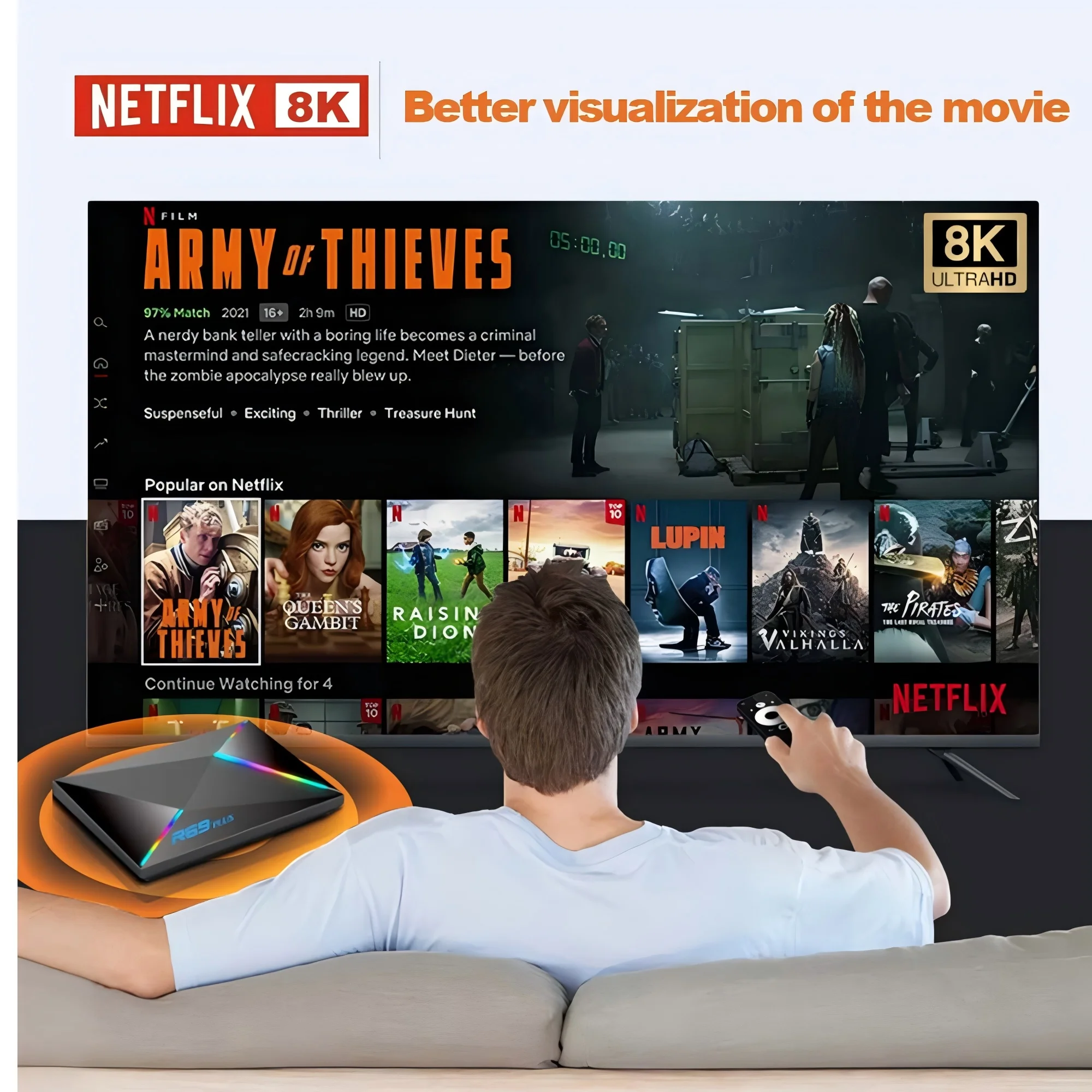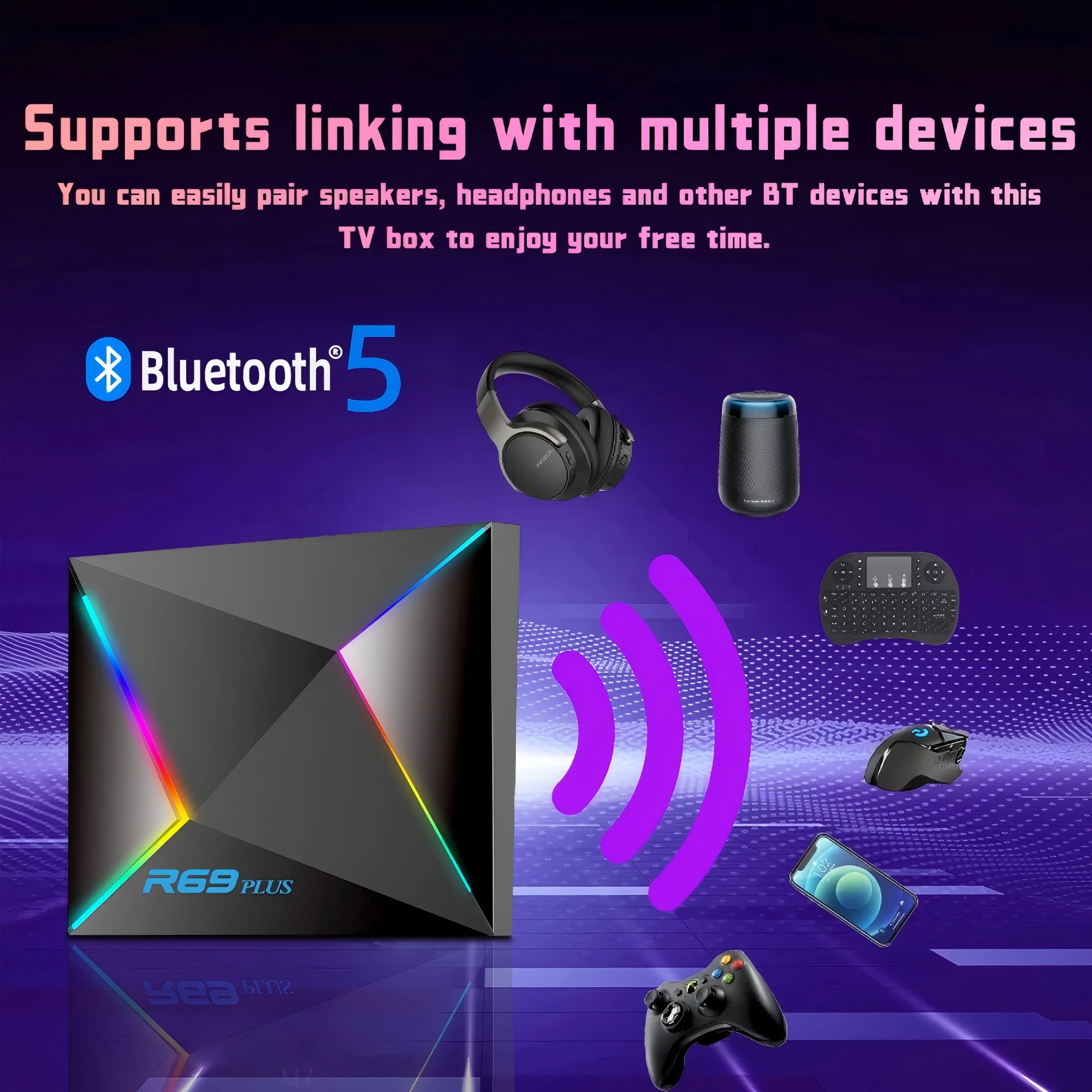 BT5.0 Admite vinculación con múltiples dispositivos Puede emparejar fácilmente altavoces, auriculares y otros dispositivos BT con esta caja de TV para disfrutar de su tiempo libre.