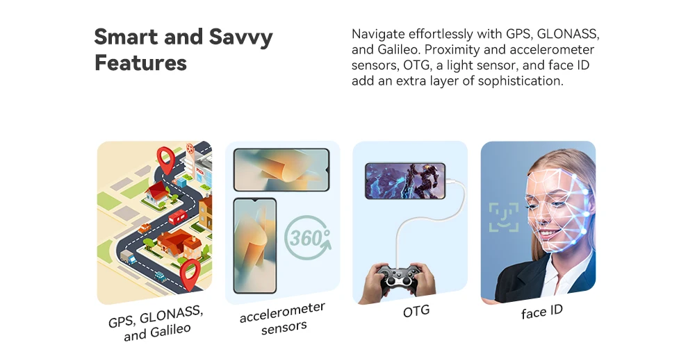Navega sin esfuerzo con GPS, GLONASS y Galileo.Los sensores de proximidad y acelerómetro, OTG, un sensor de luz y una identificación facial añaden una capa adicional de sofisticación.