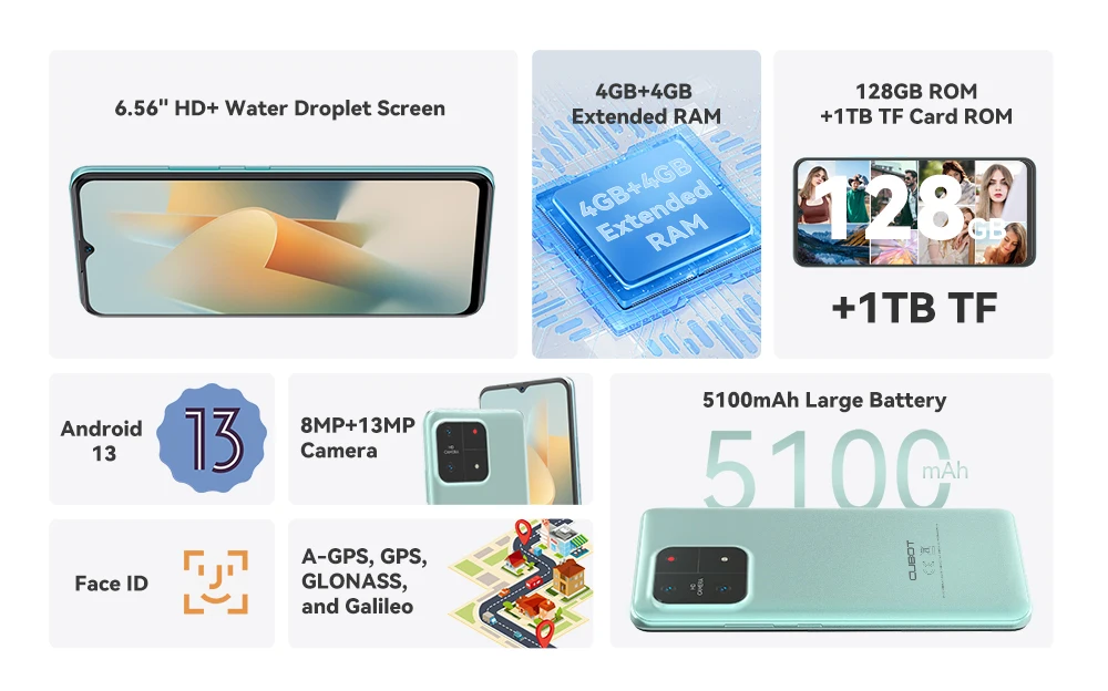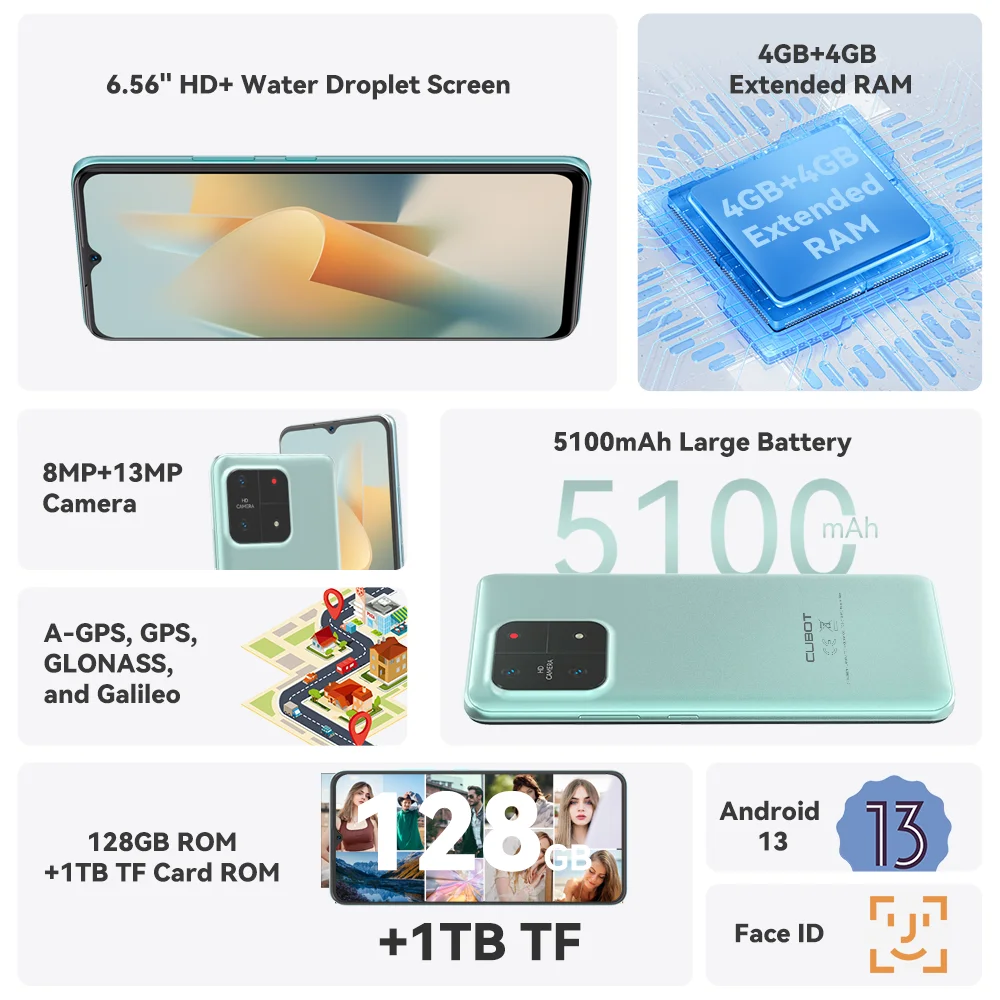 Comprar [Nuevo artículo] Cubot A1, Smartphone Android 13, Octa-core, 8GB RAM(4GB+4GB Extendido), 128GB ROM(Tarjeta TF 1TB de expansión), Pantalla HD+ de 6.56'', Cámara de 13MP, 5100mAh, Face ID, 4G phone, moviles baratos 2024