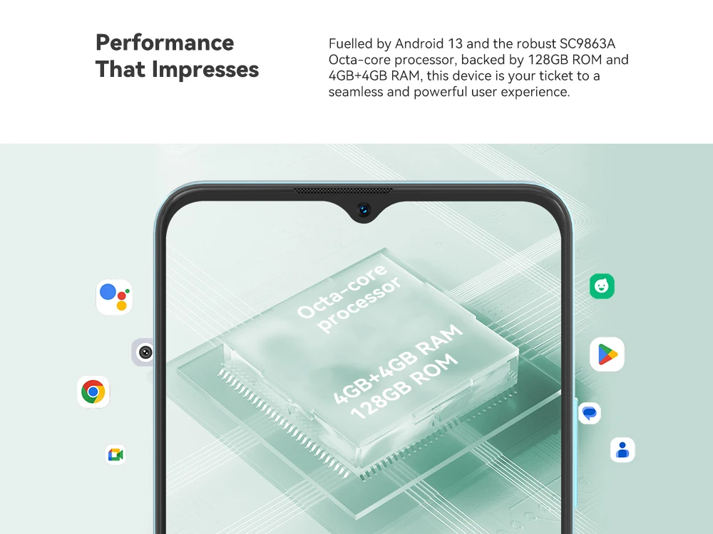 Fuentado por Android 13 y el robusto procesador Octa-core SC9863A, respaldado por 128 GB de ROM y 4 GB de RAM, este dispositivo es su boleto para una experiencia de usuario potente y fluida.