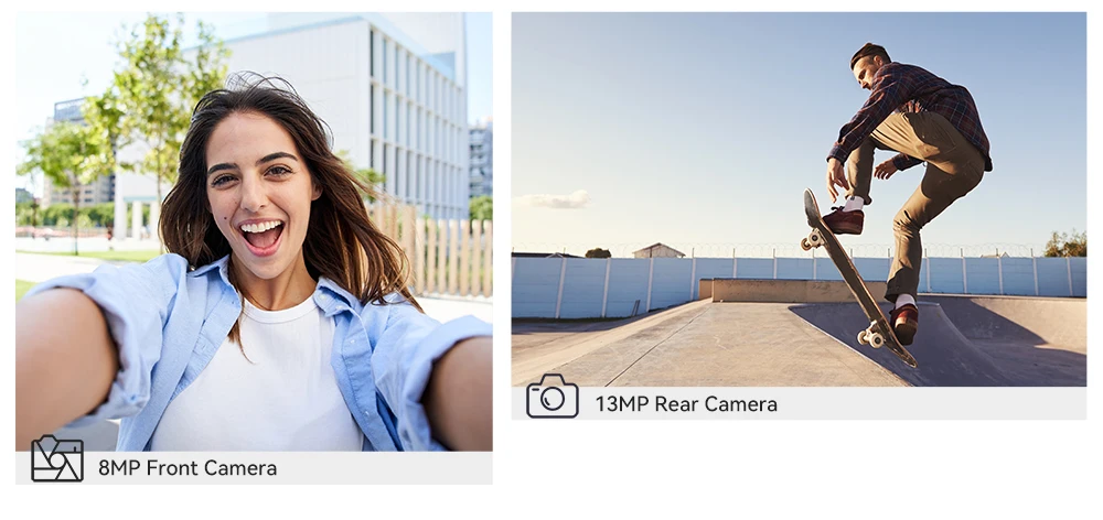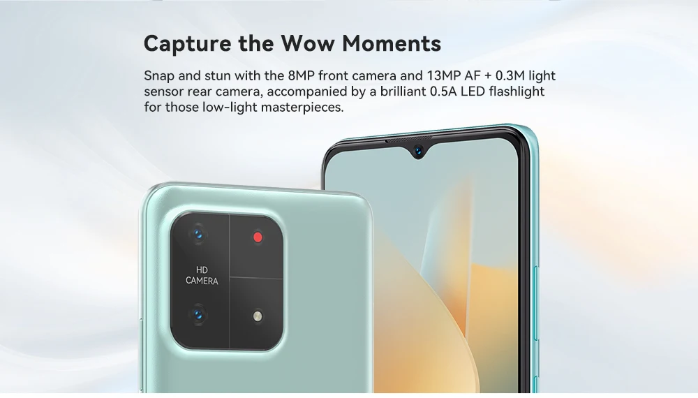 Se coloca y sorprende con la cámara frontal de 8MP y la cámara trasera con sensor de luz AF + 0,3M de 13MP, acompañada de una brillante linterna LED de 0,5 A para esas obras maestras con poca luz.