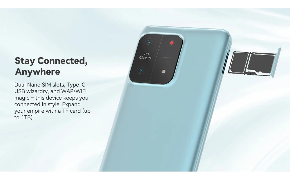 Ranuras duales Nano SIM, asistente USB tipo C y magia WAP/WIFI: este dispositivo lo mantiene conectado con estilo.Amplía tu imperio con una tarjeta TF (hasta 1 TB).