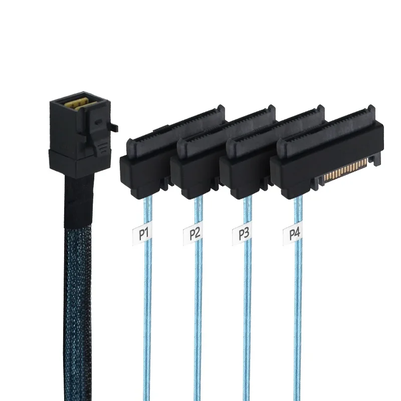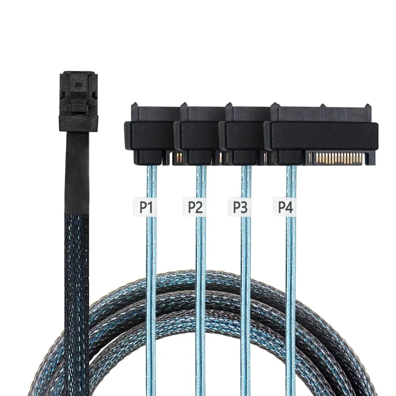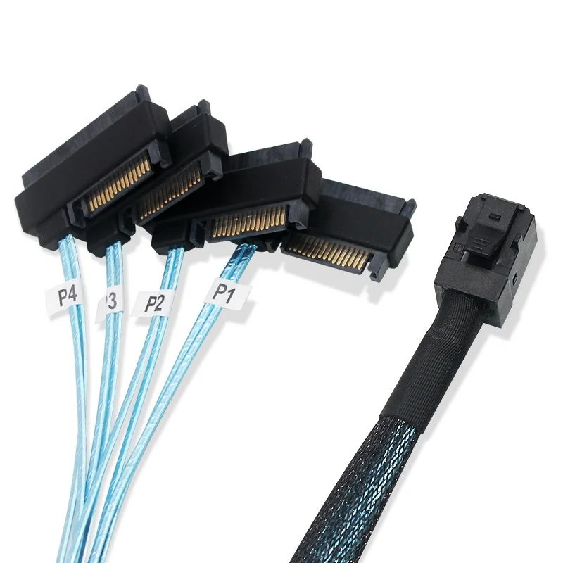 Datos internos Mini SAS + fuente de alimentación conecta el controlador SAS a cuatro unidades SAS HDD independientes; el cable fanout frontal tiene 1 Conector host SFF 8643 Mini SAS de pestillo y 4 conectores de disco duro SFF 8482 discretos de destino SAS