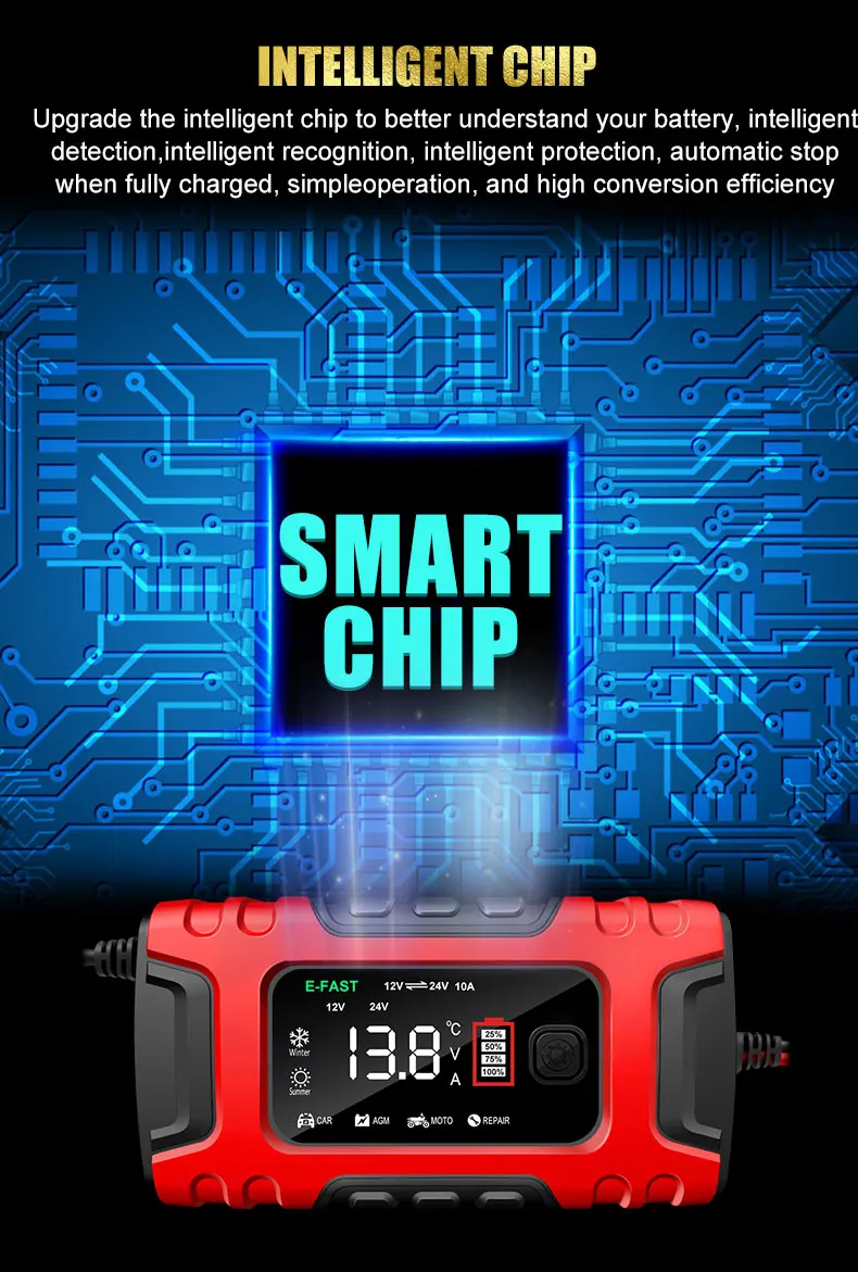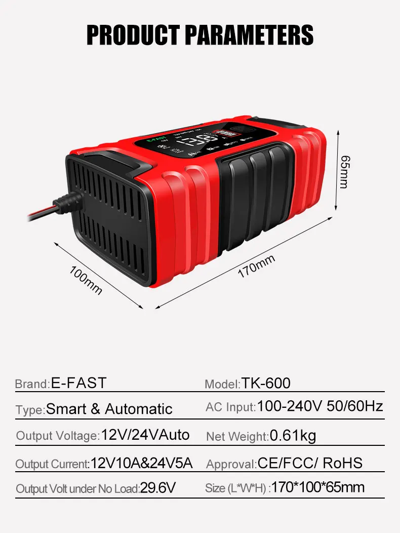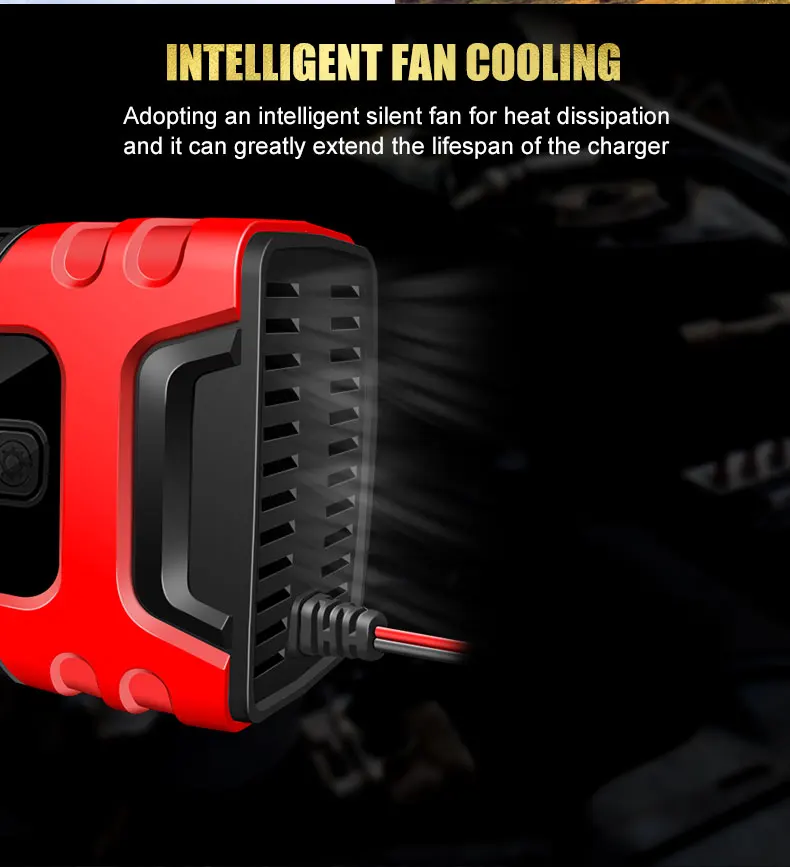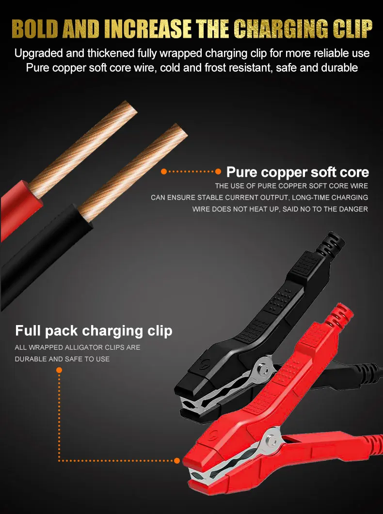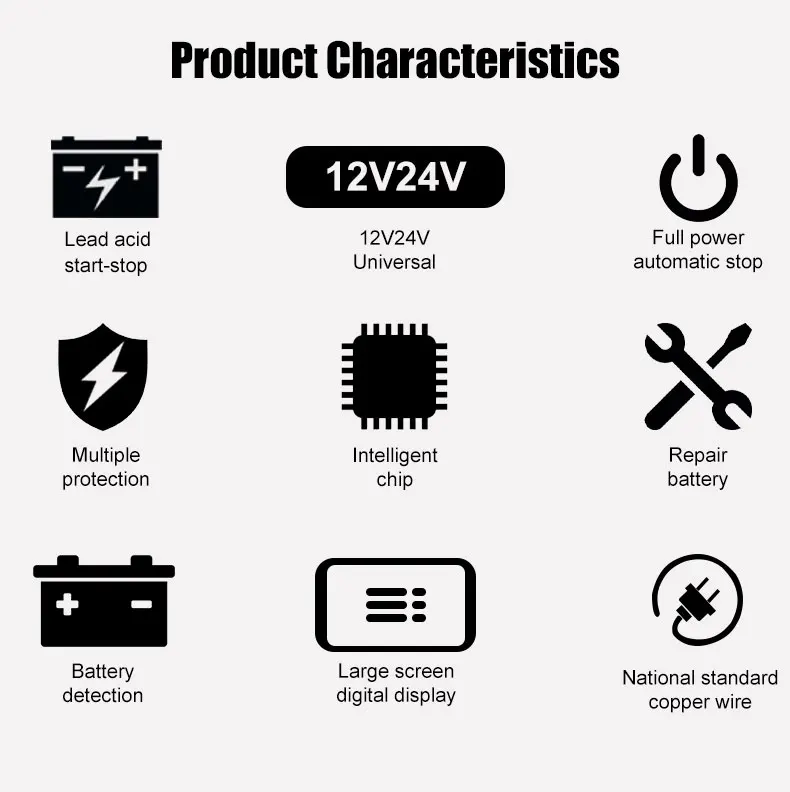 • Carga rápida inteligente :Este cargador de batería para automóviles ofrece una carga inteligente rápida, maximizando la eficiencia y reduciendo el tiempo de espera.