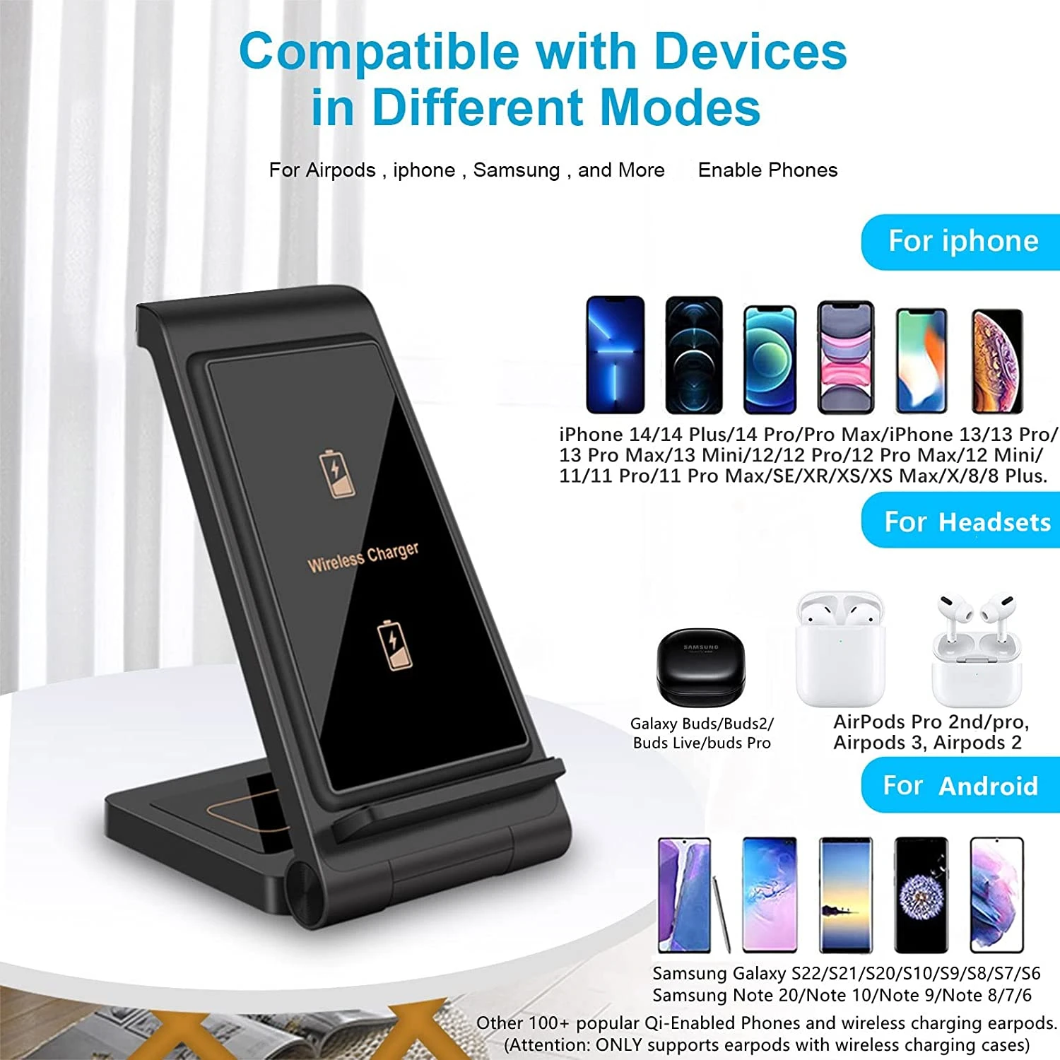 Carga inalámbrica: 20W/15W/10W/7,5 W/5WCarga inalámbrica rápida de hasta 15W para iPhone 14/14 Plus/14 Pro/14 Pro Max/13/13 Pro/13 Pro Max/13 Mini/12/12 Pro/12 Pro Max/12 Mini, samsung Galaxy Note 20/Plus,S22/S21/S20;10W para Samsung Galaxy S10,S9,S8, Note 10/9/8/7; carga inalámbrica de 7,5 W para iPhone 11/11 Pro/11 Pro Max/SE 2020/Xs Max/XR/XS/X/8/8 Plus, nuevo iPhone SE y carga inalámbrica estándar de 5W PARA TODOS Con teléfonos con función de carga inalámbrica, AirPods 3/2; AirPods Pro/Pro2, Galaxy buds/buds +, Pixel buds y más.