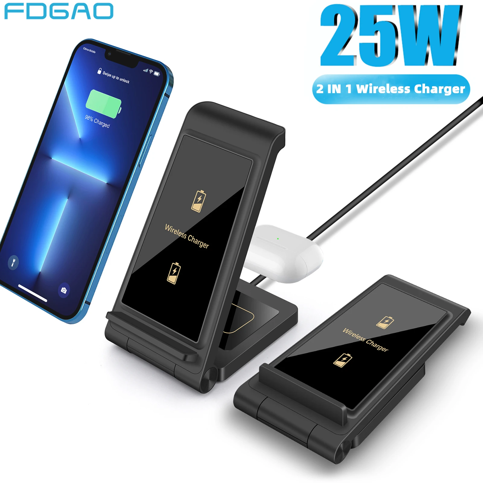 Comprar Nuevo cargador inalámbrico Dual 2 en 1 para iPhone 14 13 12 11 XS XR X 8 AirPods 3 Pro 25W carga rápida para Samsung S22 S21