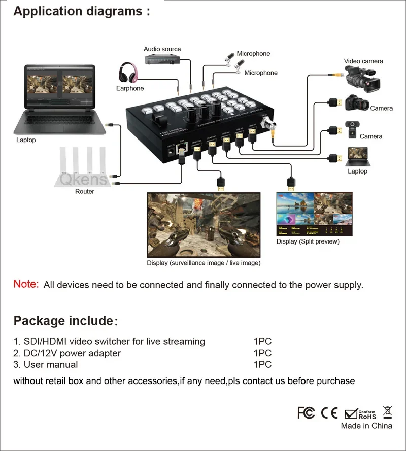 1.Conmutador de vídeo SDI/HDMI para transmisión en vivo 1PCS 2.Adaptador de corriente CC/12 V 1 unidad 3.Manual de usuario 1PCS Sin caja al por menor ni otros accesorios, si es necesario, contáctenos antes de comprar.