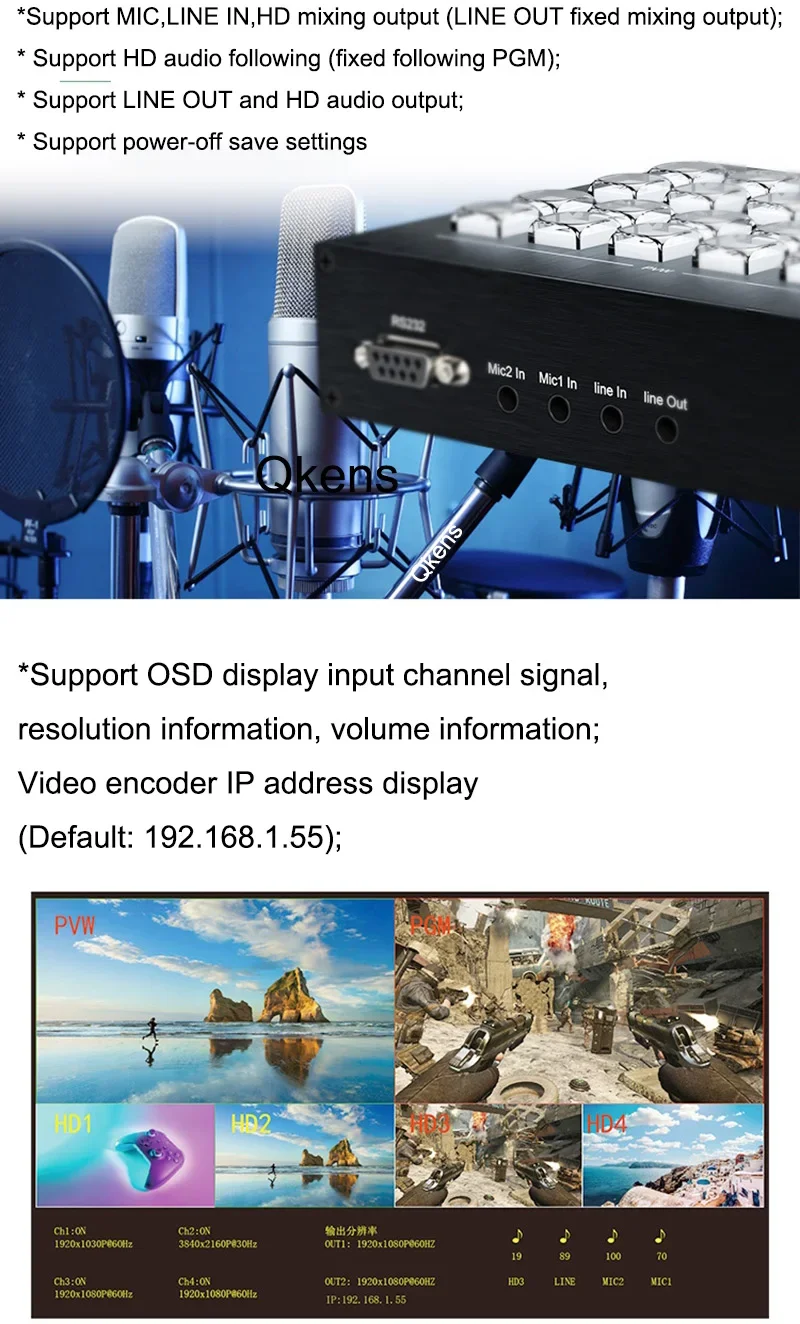 * Conmutación de 4 cámaras, admite salidas duales PGM/PVW, transiciones perfectas, Efectos de desvanecimiento/desvanecimiento, y más. * 1 entrada de señal SDI admite una resolución de 1920*1080/60hz y admite transmisión sin pérdidas de 100 m; * Convierte fácilmente señales SDI de nivel de transmisión; * 3 entradas HDMI; 2 salidas HDMI; * 1 puerto RJ45 Gigabit Ethernet compatible con protocolos RTMP/RTSP; * Codificador de hardware incorporado, admite codificación H.264/H.265; * Admite señal del canal de entrada de pantalla OSD, información de resolución, información de volumen; Visualización de la dirección IP del codificador de video (predeterminado: 192.168,1,55); * Admite salida de mezcla MIC,LINE IN,HD (salida de mezcla fija LINE OUT); * Admite seguimiento de audio HD (pgm seguimiento fijo); * Admite salida de audio LINE OUT y HD; * Admite configuración de guardado de apagado; * Teclas de alta calidad, diseño de retroiluminación de color.