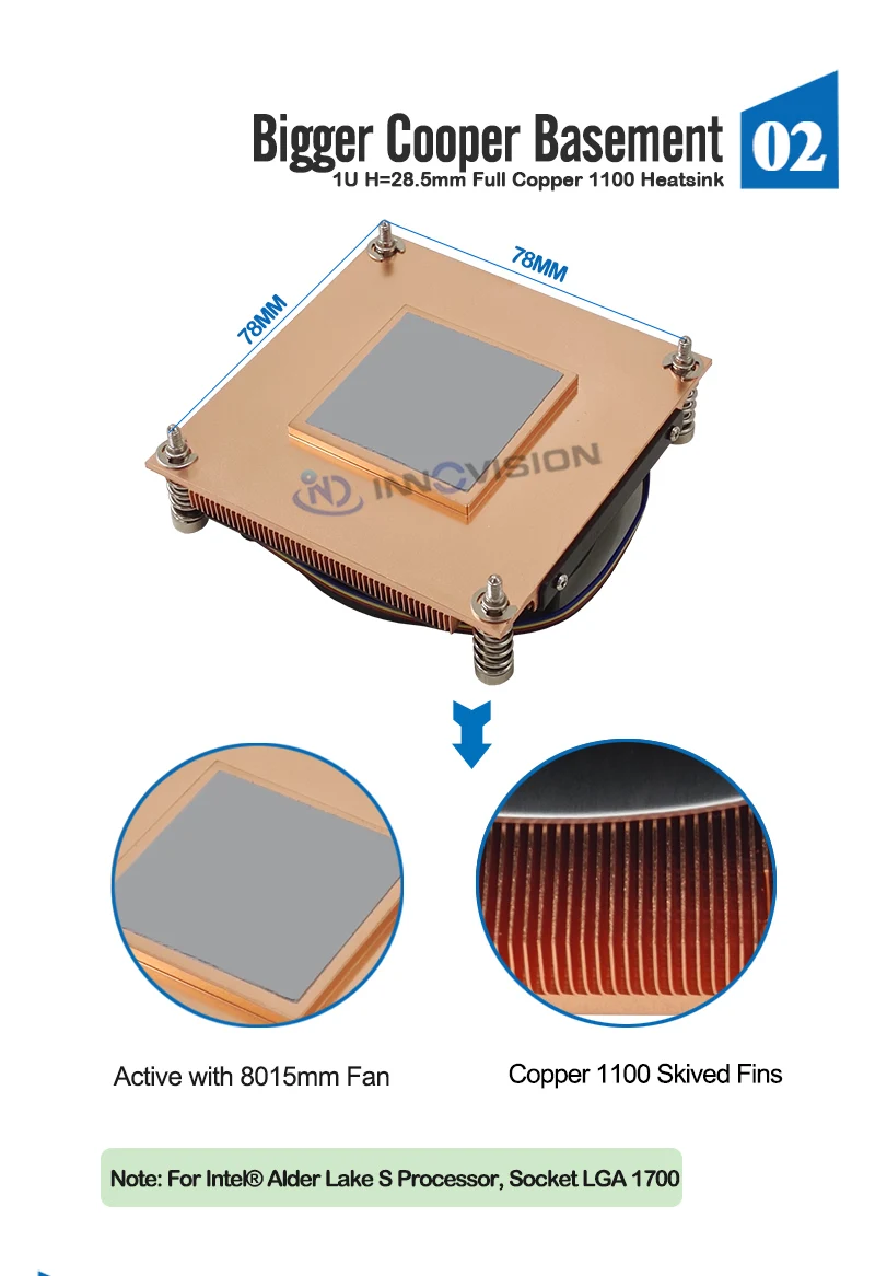 Nuevo Enfriador de CPU activo 1U para Intel LGA1700 78x78MM con espacio entre orificios 125W TDP
