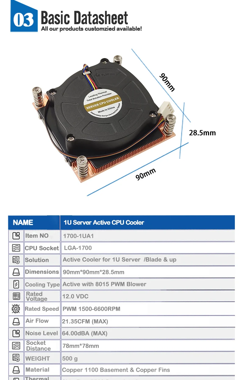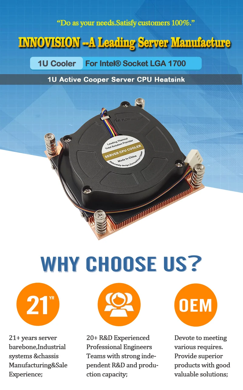 17001UA1 Admite potencia de CPU de hasta 125 vatios de disipación de calor. Recomendado para procesador Intel Alder Lake S, ventilador con enchufe LGA 1700, 80 x 80 x 25 mm con función PWM, sótano de cobre 1100 y aletas de cobre, enfriador activo de CPU para servidor 1U