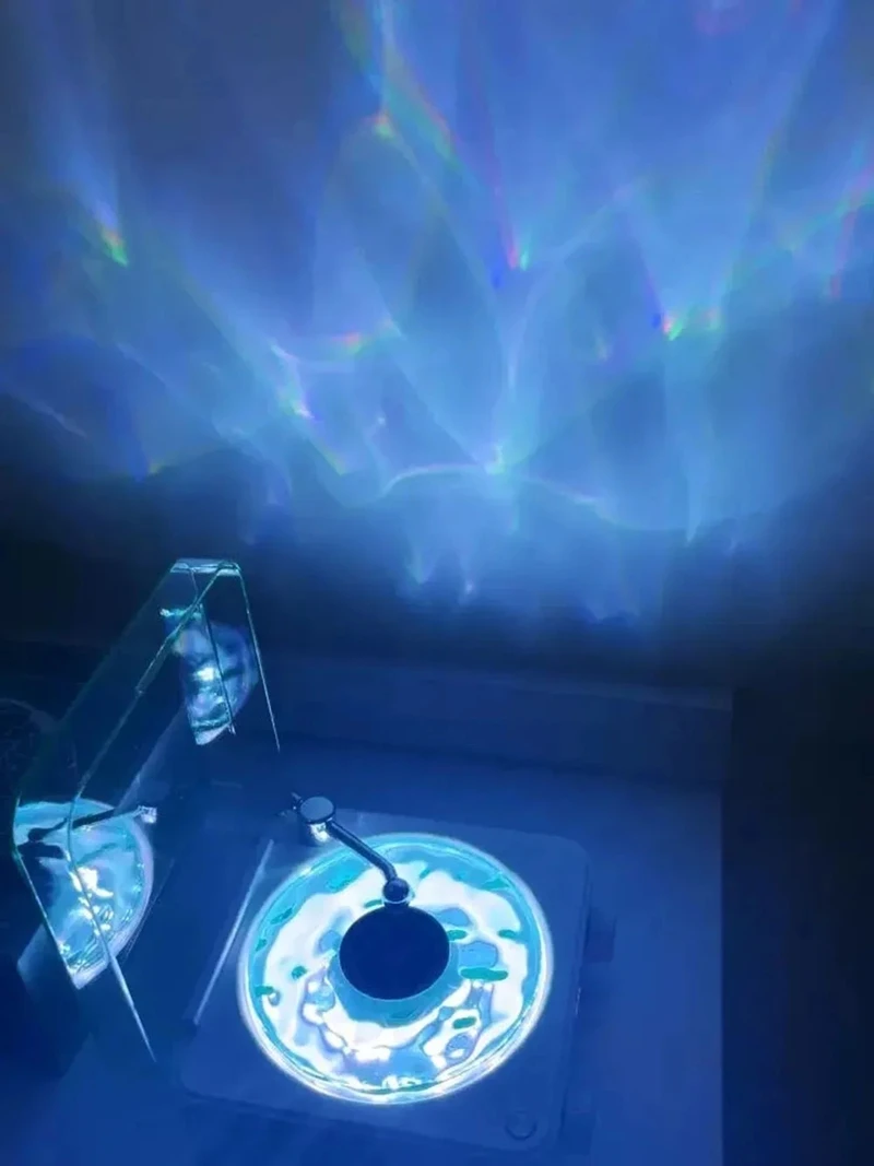El plato giratorio transparente con ondas de agua puede girar con la música, creando una atmósfera magnífica en la habitación.El diseño de pantalla no deslumbra por la noche y la pantalla se puede despertar tocando el cuerpo o vibrando el escritorio.