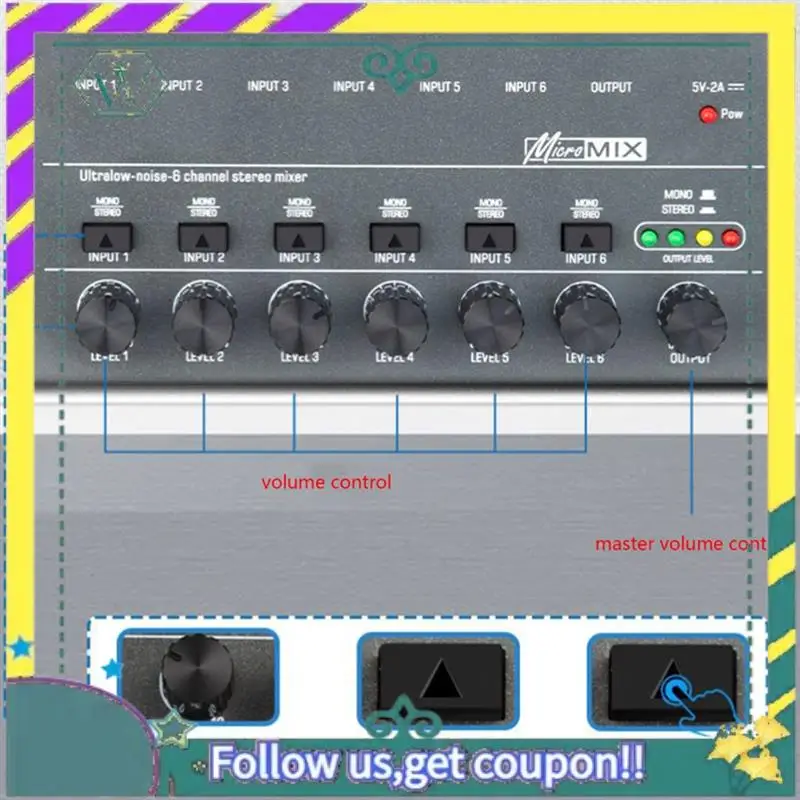Este mezclador de audio tiene 6 canales de entrada y 1 línea de salida de canal.