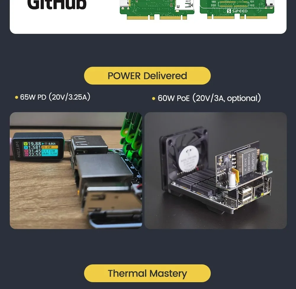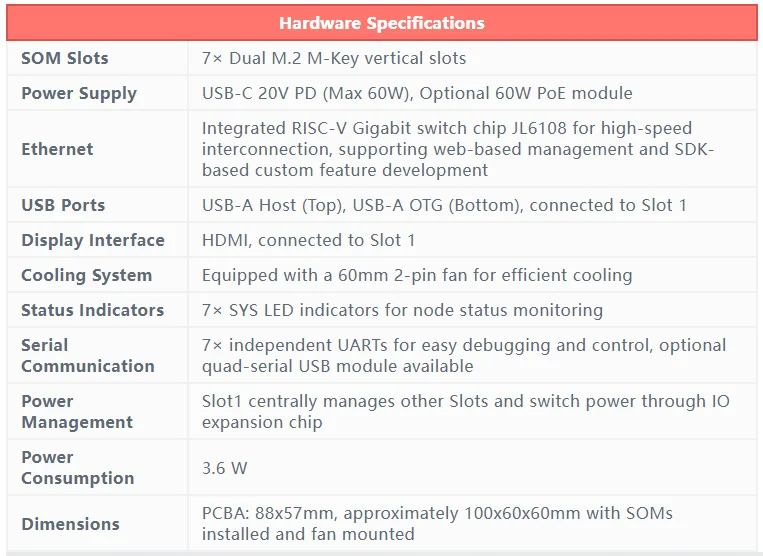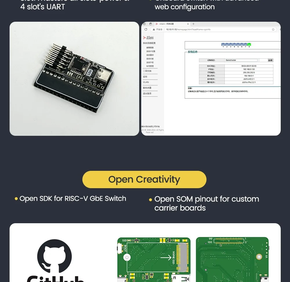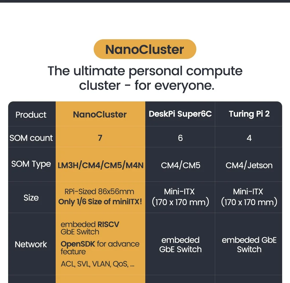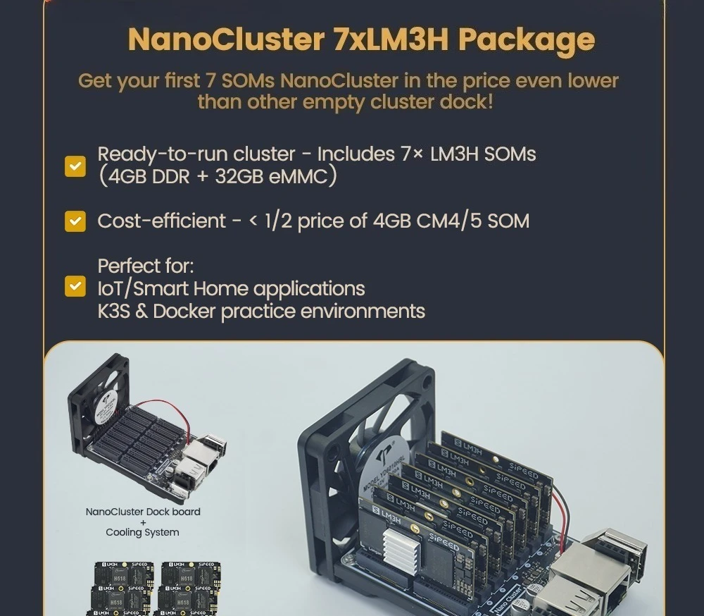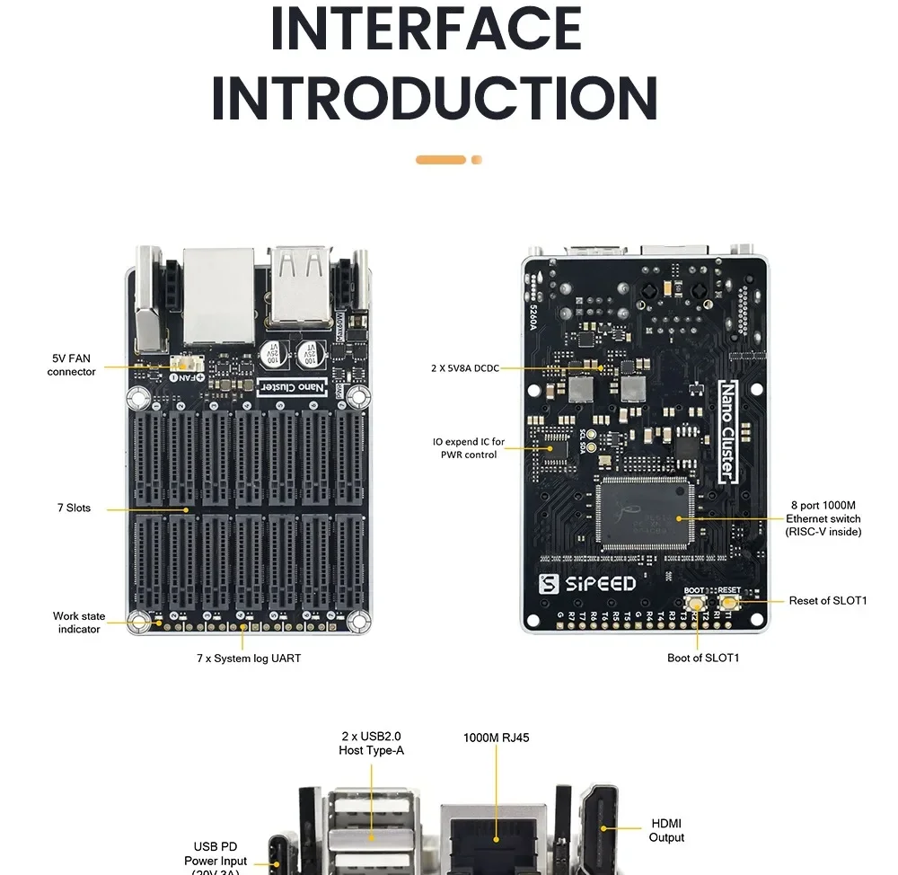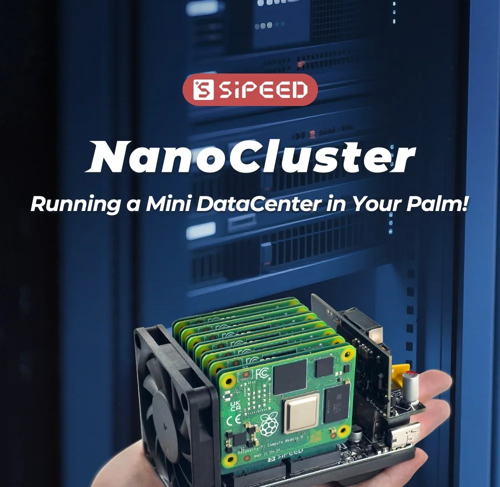 [] NanoCluster es una placa de grupo ultraminiatura desarrollada por Sipeed, que cuenta con 7 ranuras SOM interconectadas a través de un conmutador Gigabit basado en RISC-V.Admite fuente de alimentación USB-C PD y expansión PoE opcional.Además, NanoCluster proporciona UART independiente y control de potencia, lo que la convierte en una plataforma básica ideal para usuarios de HomeLab que exploran informática distribuida, Kubernetes, Docker y computación de borde.