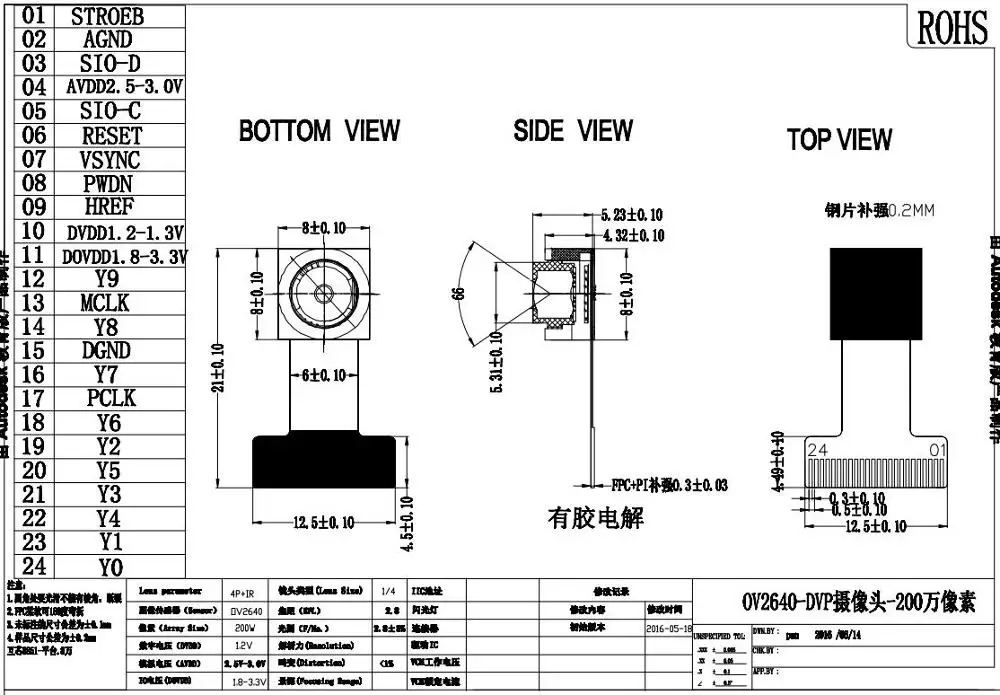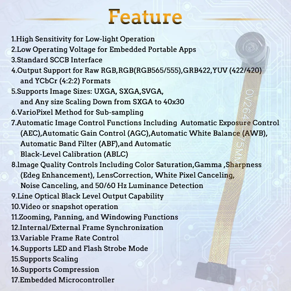 El sensor de imagen OV2640 tiene 2 millones de píxeles (1632x1232 píxeles), su tamaño es pequeño, el voltaje de funcionamiento es bajo y proporciona todas las funciones de una cámara UXGA de un solo chip y un procesador de imágenes.A través del control del bus SCCB, puede generar datos de muestreo de 10 bits de varias resoluciones en forma de fotograma completo, submuestreo, ventanas, etc.La imagen UXGA máxima de este producto es de 15 fotogramas por segundo.El usuario puede controlar completamente la calidad de la imagen, el formato de los datos y el método de transmisión.Todas las funciones de procesamiento de imágenes, incluida curva gamma, balance de blancos, saturación, croma, etc.Se puede programar a través de la interfaz SCCB.El sensor de imagen OmmiVision utiliza una tecnología de sensor única para mejorar la calidad de la imagen y obtener imágenes en color claras y estables al reducir o eliminar defectos ópticos o electrónicos como ruido de patrón fijo, cola, flotación, etc.