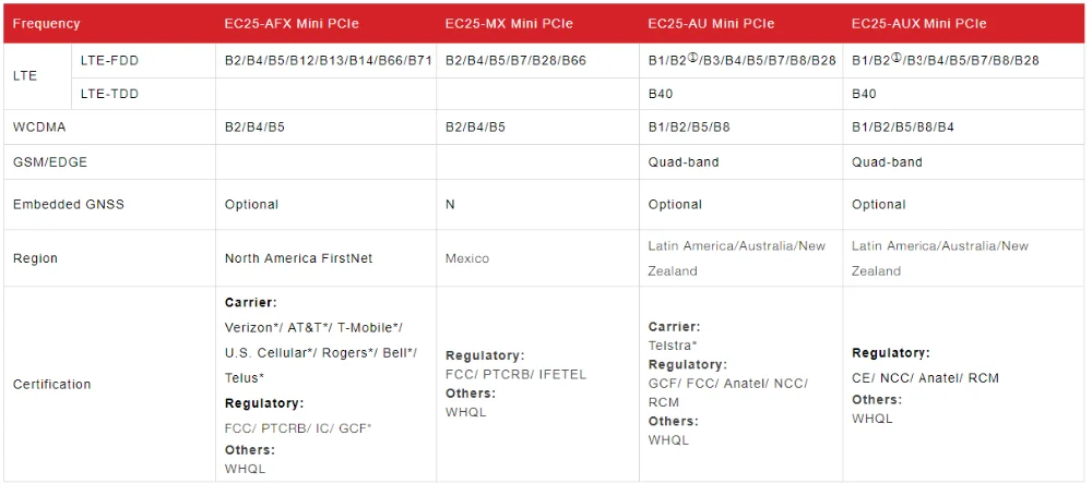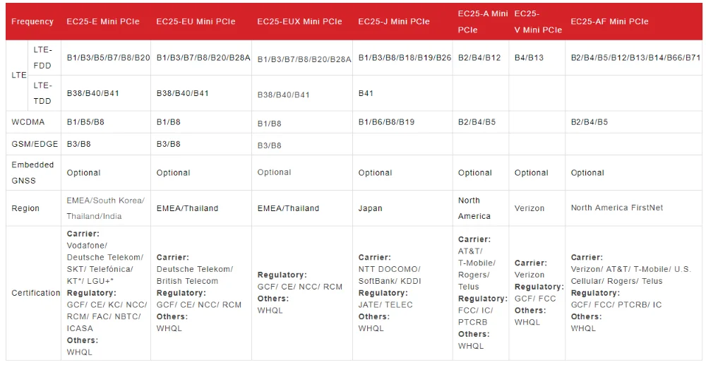 EC25 Mini PCIe contiene 11 variantes: EC25-E Mini PCIe, EC25-EU Mini PCIe, EC25-EUX Mini PCIe, EC25-J Mini PCIe, EC25-A Mini PCIe, EC25-V Mini PCIe, EC25-AF Mini PCIe, EC25-AFX Mini PCIe, EC25-MX Mini PCIe, EC25-AU Mini PCIe y EC25-AUX Mini PCIe.Esto lo hace compatible con versiones anteriores de las redes EDGE y GSM/GPRS existentes, lo que garantiza que se pueda conectar incluso en áreas remotas sin cobertura 4G o 3G.