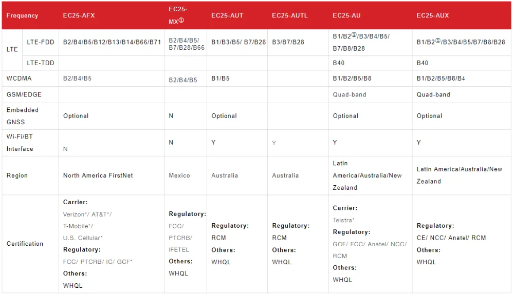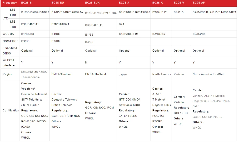 EC25 contains 13 variants: EC25-E, EC25-EU, EC25-EUX, EC25-J, EC25-A, EC25-V, EC25-AF, EC25-AFX, EC25-MX, EC25-AUT, EC25-AUTL, EC25-AU and EC25-AUX. This makes it backward-compatible with existing EDGE and GSM/GPRS networks, ensuring that it can be connected even in remote areas devoid of 4G or 3G coverage.