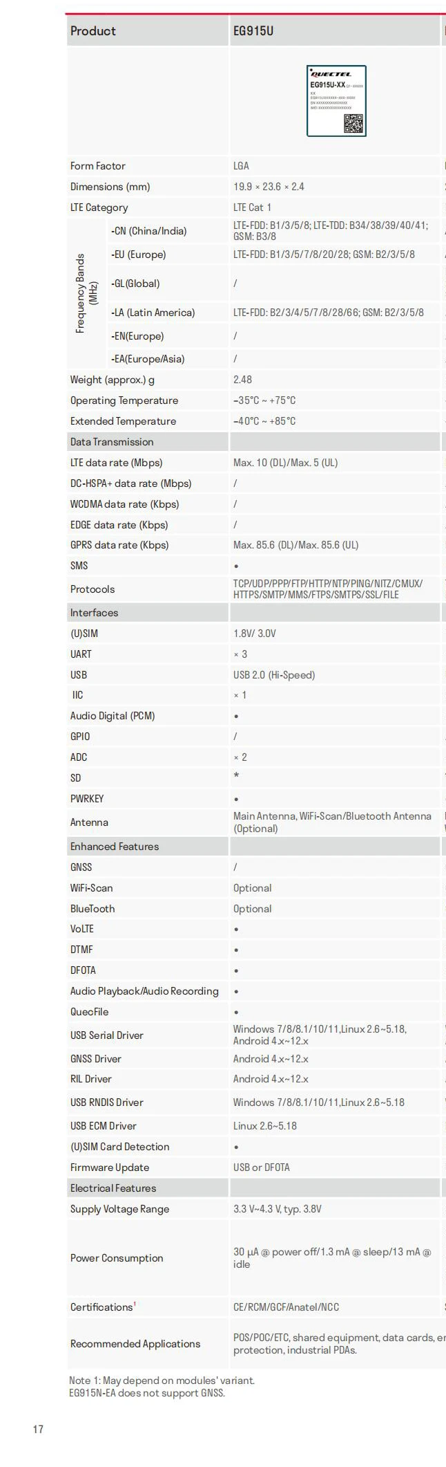 La serie EG915U incluye cuatro modelos: EG915U-CN, EG915U-EU, EG915U-EC y EG915U-LA, cumpliendo con la cobertura de bandas de frecuencia de diferentes países y regiones.La serie EG915U adopta tecnología de grabado láser, que tiene las ventajas de una apariencia hermosa, una textura metálica fuerte, una mejor disipación del calor, información difícil de borrar y una mejor adaptabilidad a las necesidades de automatización.
