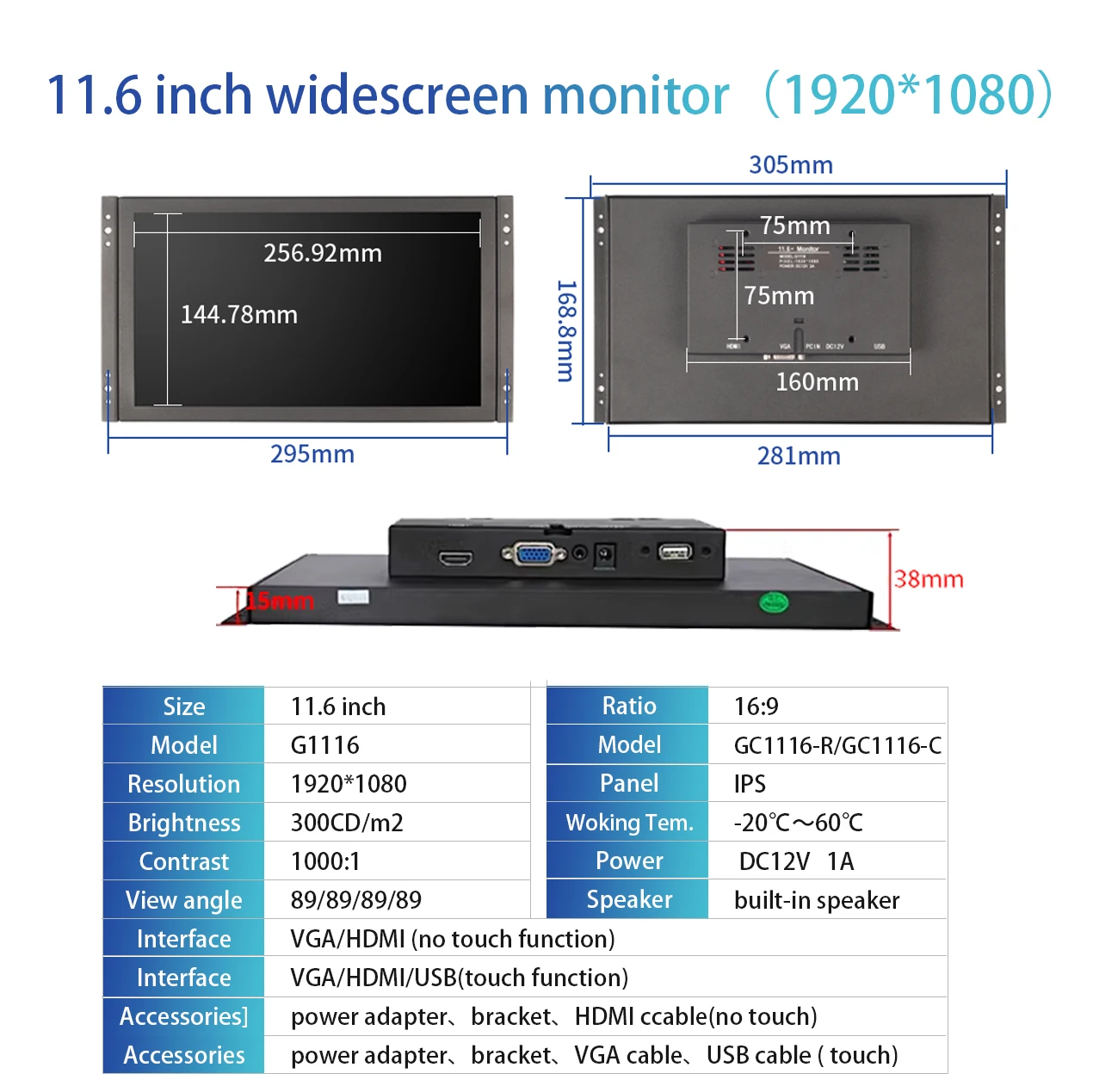The specifications of 11.6 Inch 16:9 Industrial Monitor