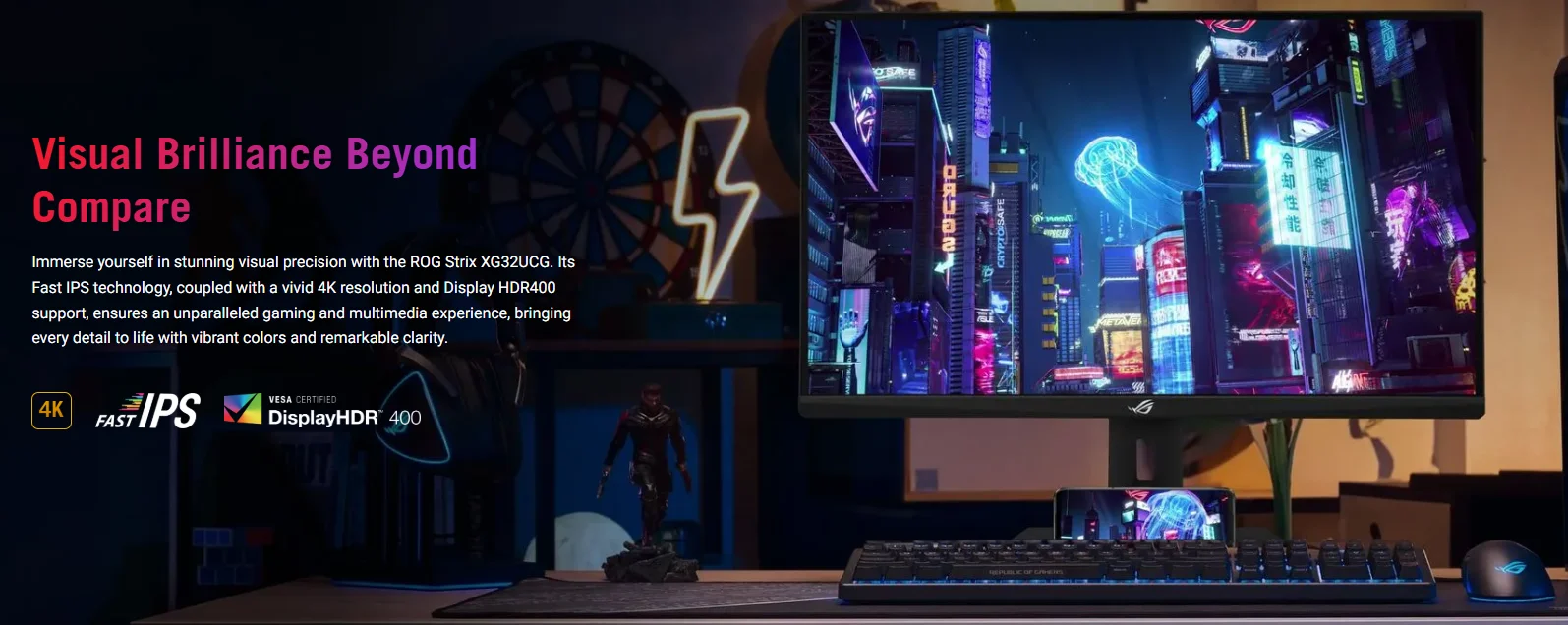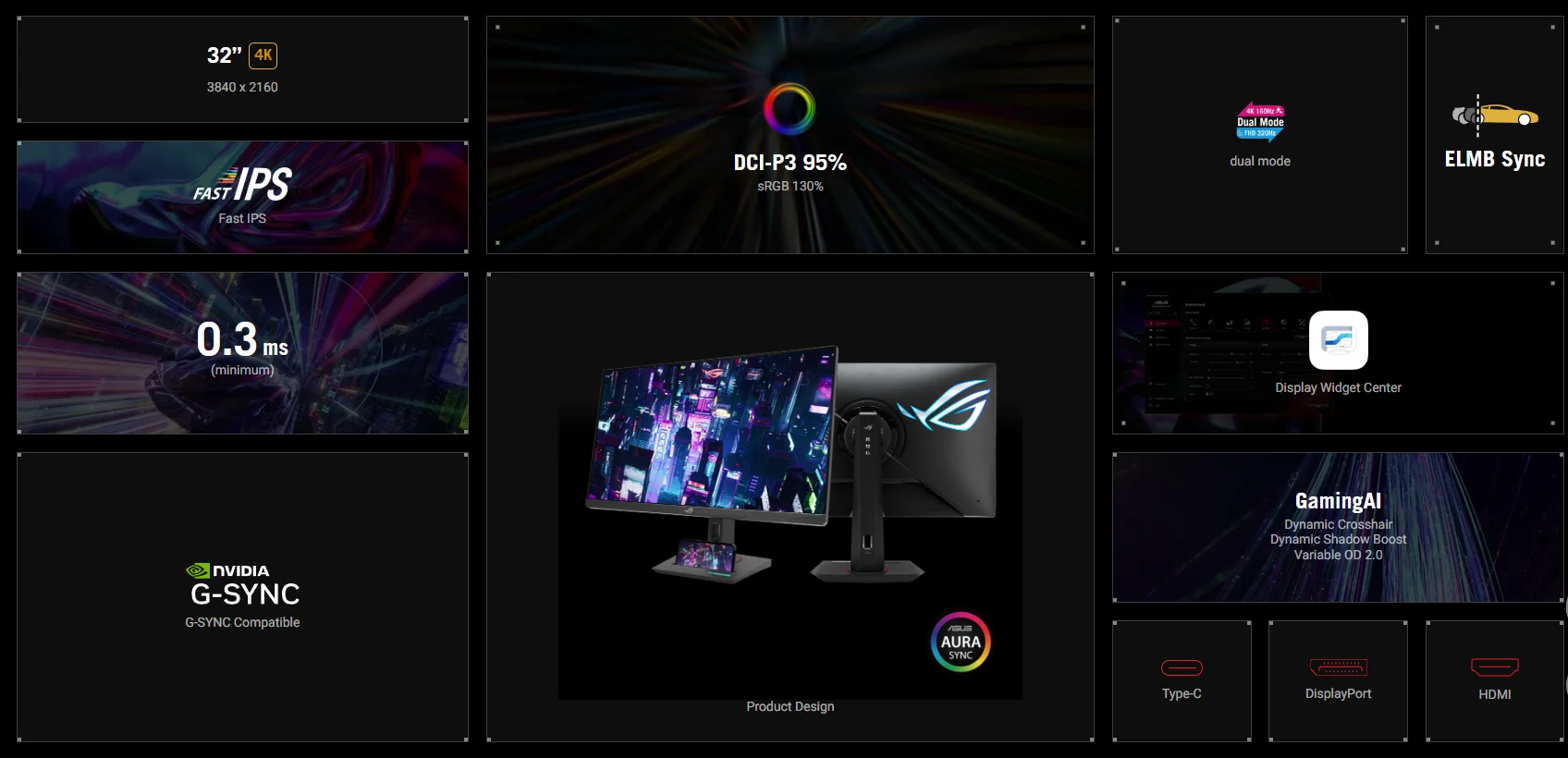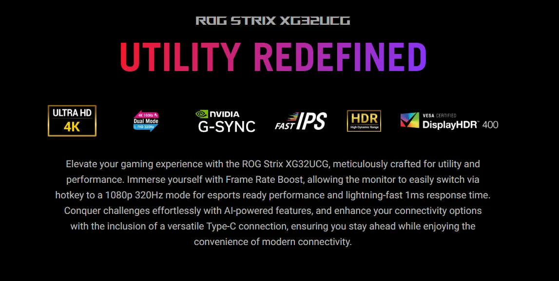 Especificación Modelo ROG Strix XG32UCG Tamaño del panel 32 Relación de aspecto 16:9 Tipo de panel IPS Resolución 3840x2160 Brillo 400 cd/㎡ Relación de contraste 1000:1 Frecuencia de actualización 160 Hz Puertos de E/S DisplayPort 1.4x 1 (HBR3) HDMI (v2.1)x 1 USB-Cx 1 (modo DP Alt) Conector para auriculares: Sí Dimensión de la caja 90.0 x 52,6 x 22,4 cm Peso bruto 12,1 kg (26,68 libras)Pago: