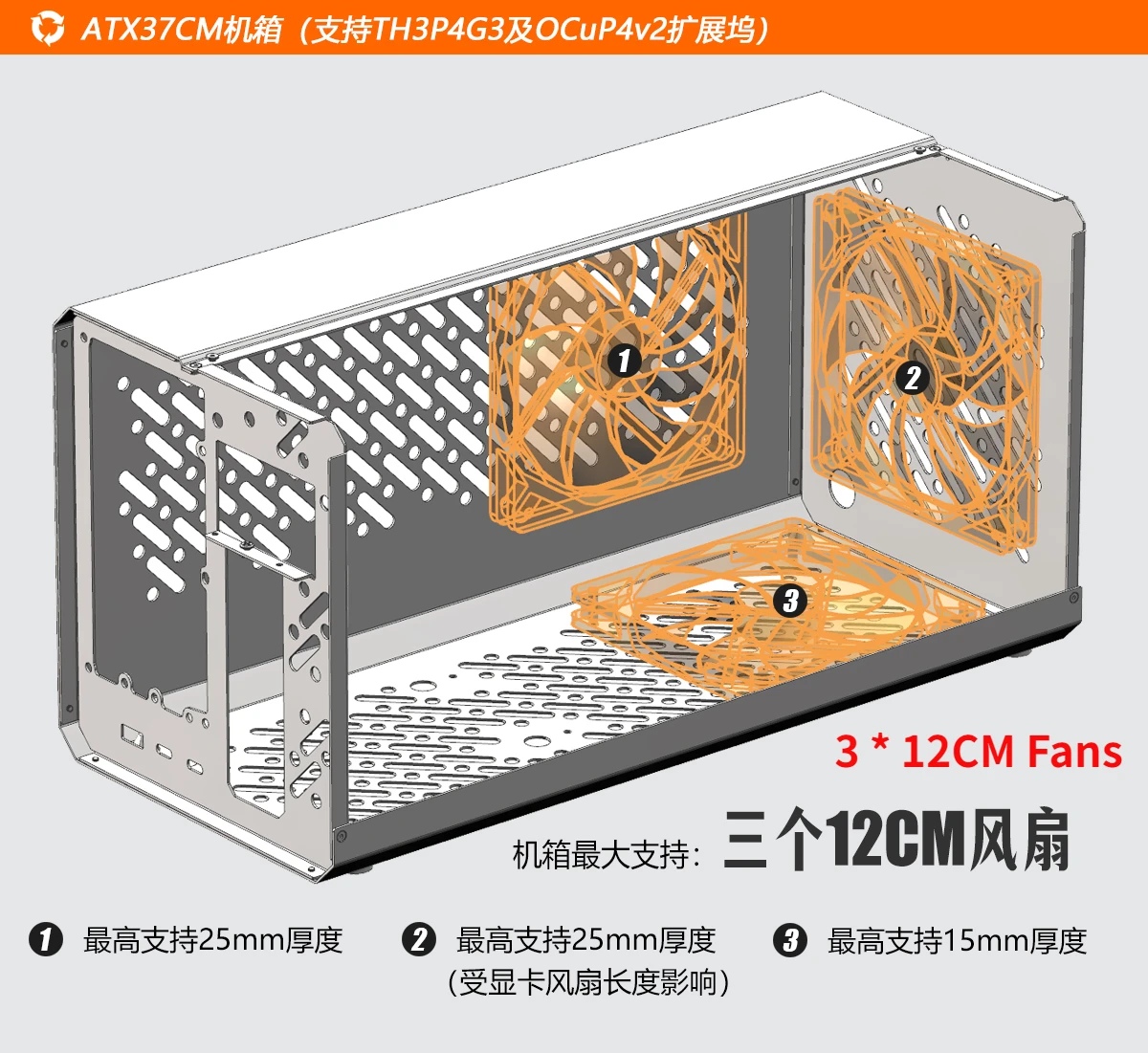 Se pueden instalar un máximo de tres ventiladores de refrigeración de 12 CM en el chasis ATX37CM