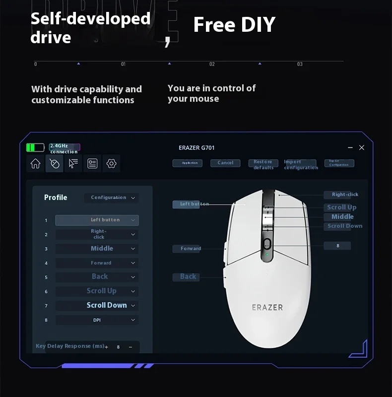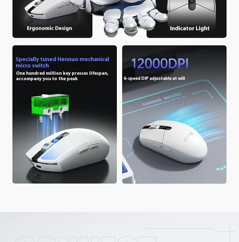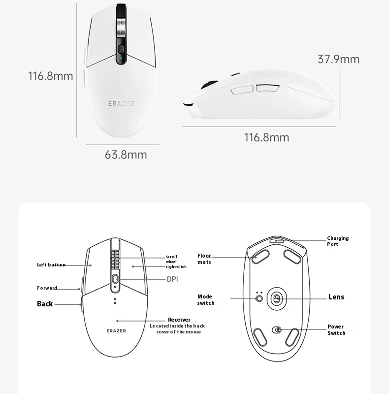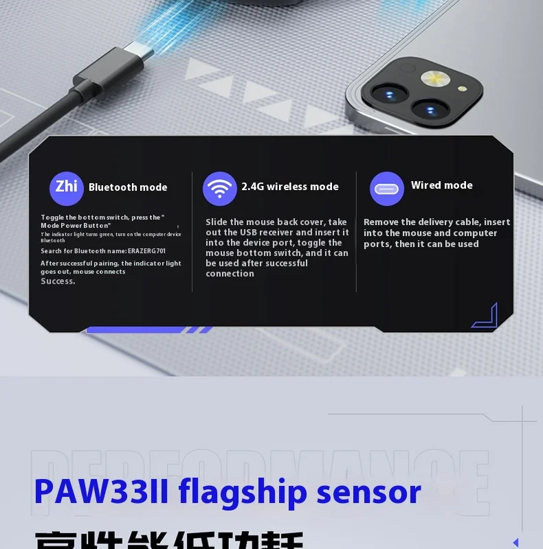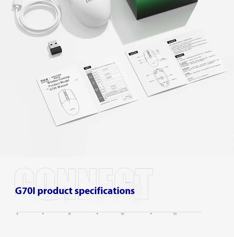Nombre del producto: Ratón inalámbrico para juegos G701 Método de conexión: conexión por cable/conexión de receptor 2.4G/Bluetooth Voltaje y corriente: 3,7 V-13 mA Vida útil del botón: 100 millones de veces Peso: 85 g ± 5 g Tamaño: 116,8 * 63,8 * 37,9 mm Sistema de adaptación: Admite sistemas operativos como WINDOWS 7/8/10/11/OS