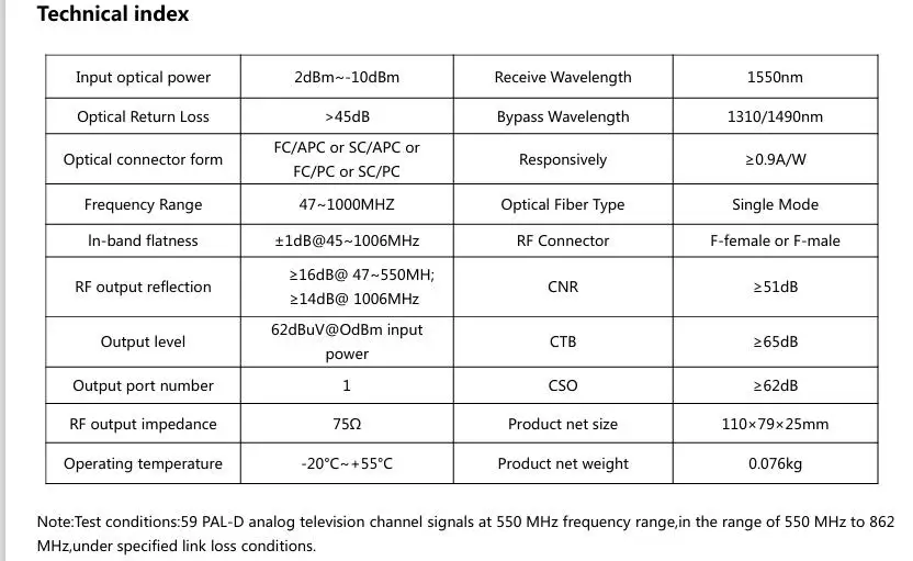 Volumen y alta confiabilidad, adopción de carcasa de aleación de aluminio. Es un producto ideal para construir red FTTHCATV. Incorporado