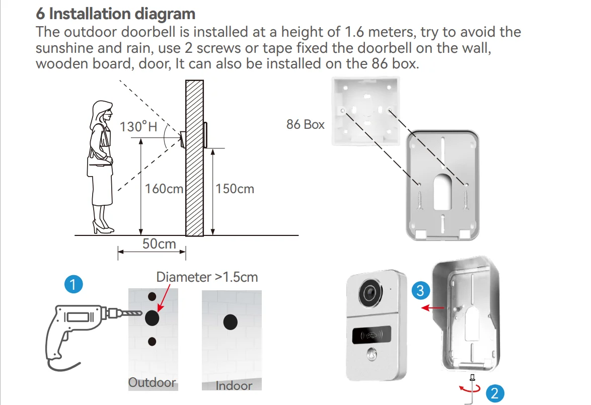 1.Utilice brocas para perforar tres agujeros.A través de estos cables de 2 pines, utilice anclajes si instala un timbre exterior en ladrillo o hormigón.