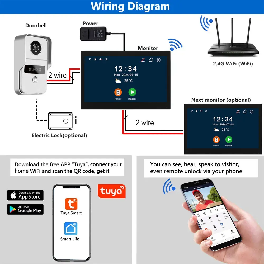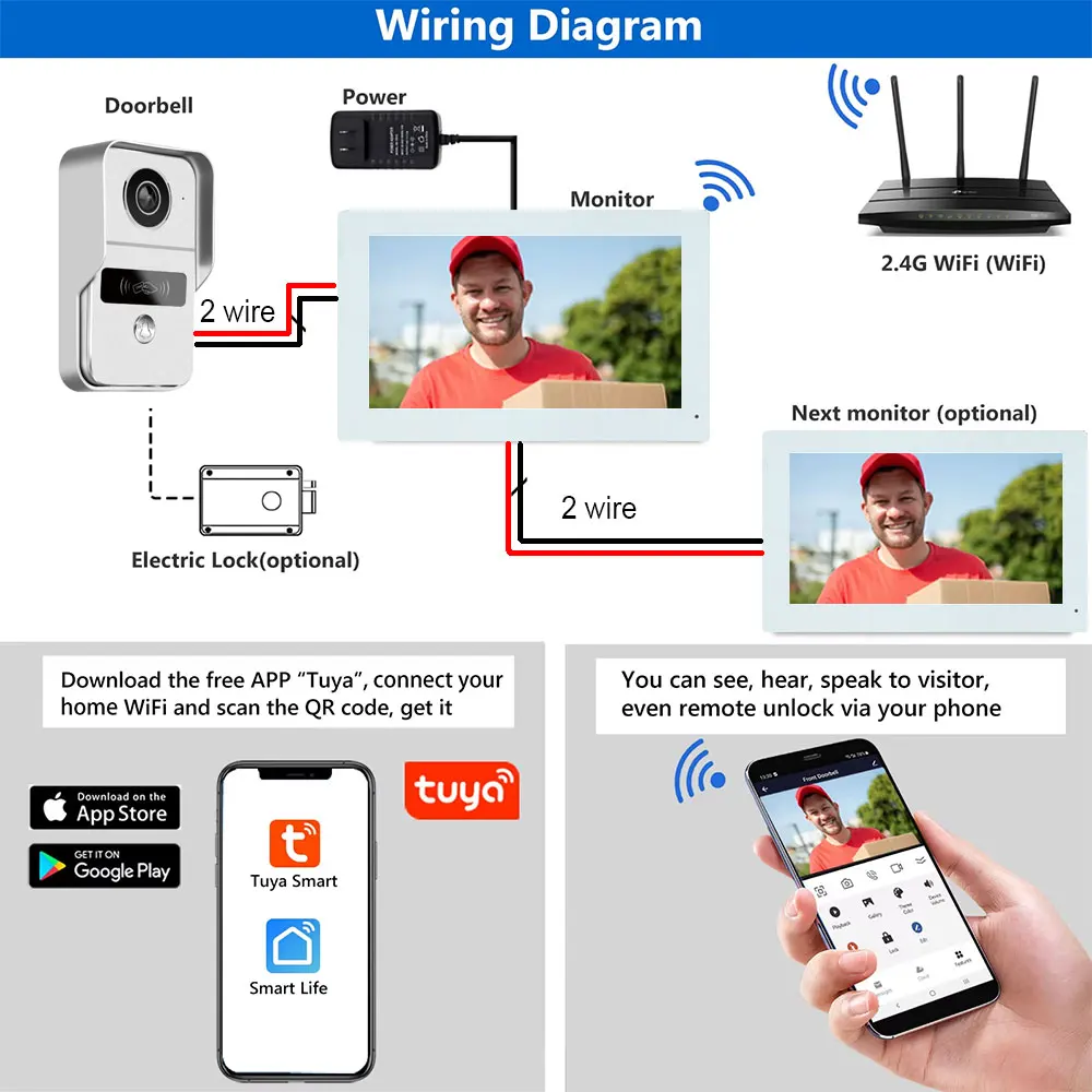 Timbre Wifi, sistema de videoportero de 2 cables para el hogar, Monitor táctil inteligente Tuya 1080P, protección de seguridad