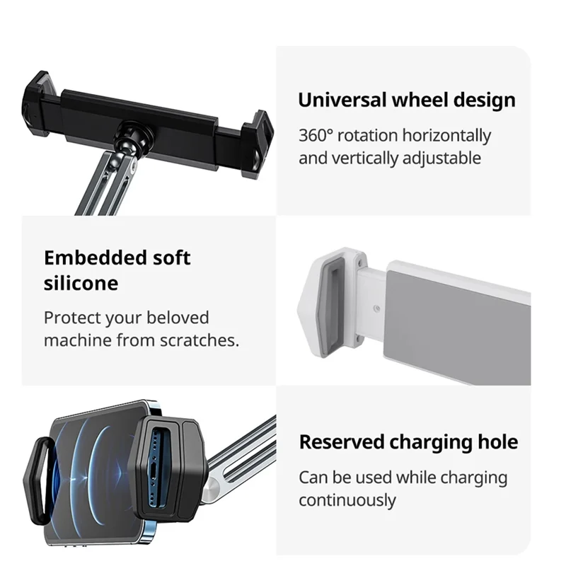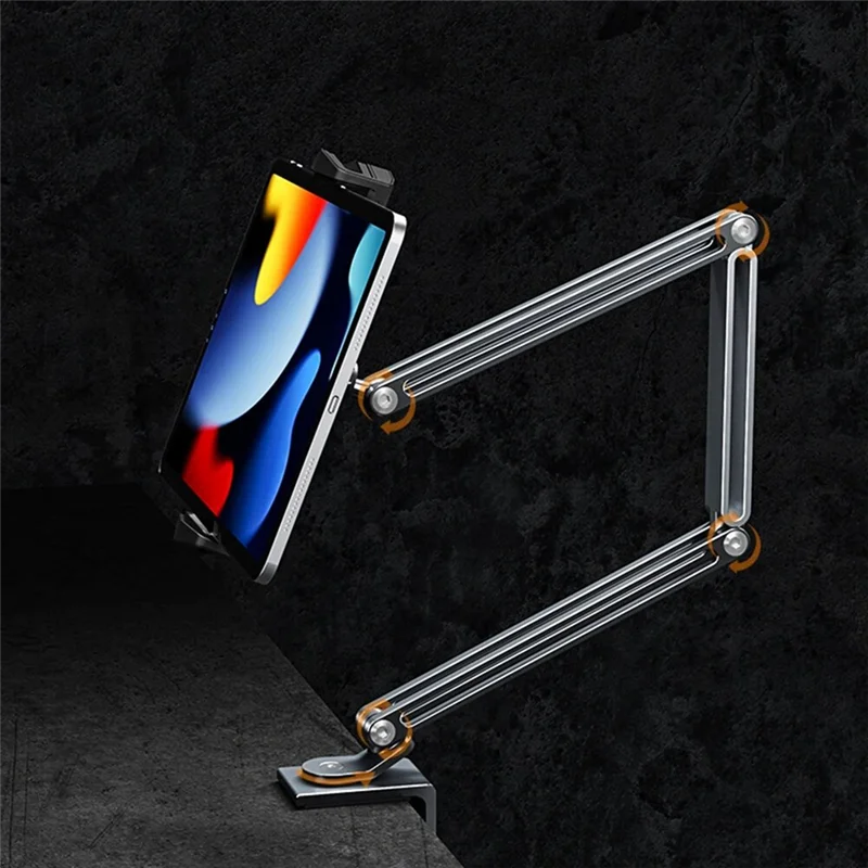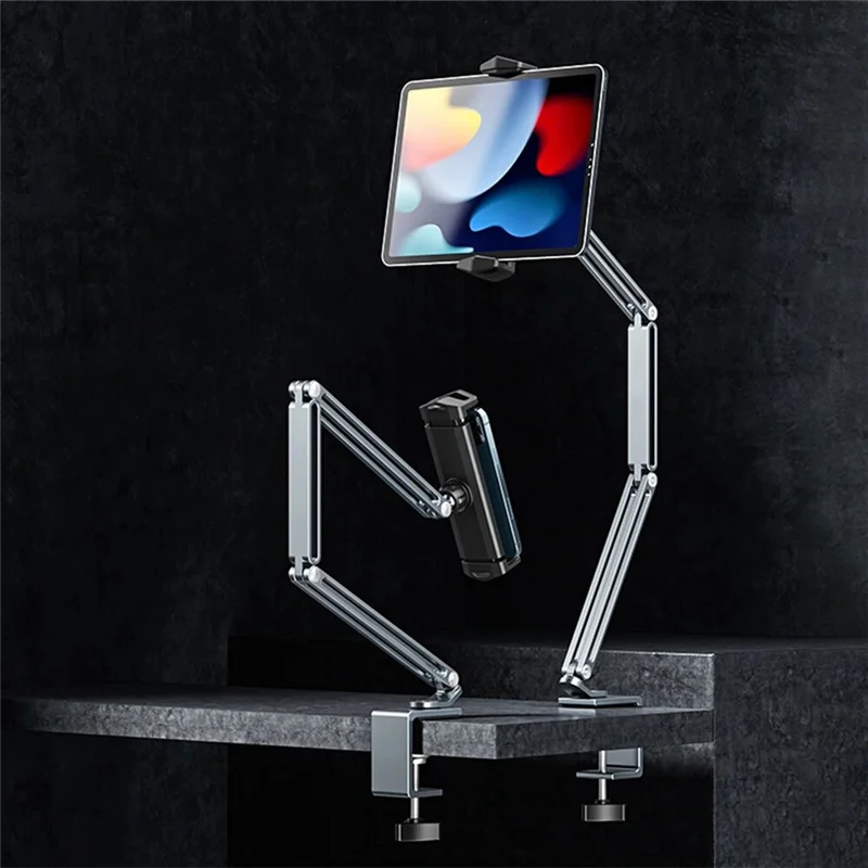 Soporte de montaje de brazo de aluminio resistente: el brazo de aluminio del soporte proporciona un soporte estable y seguro para su dispositivo, asegurando que permanezca en su lugar mientras trabaja.