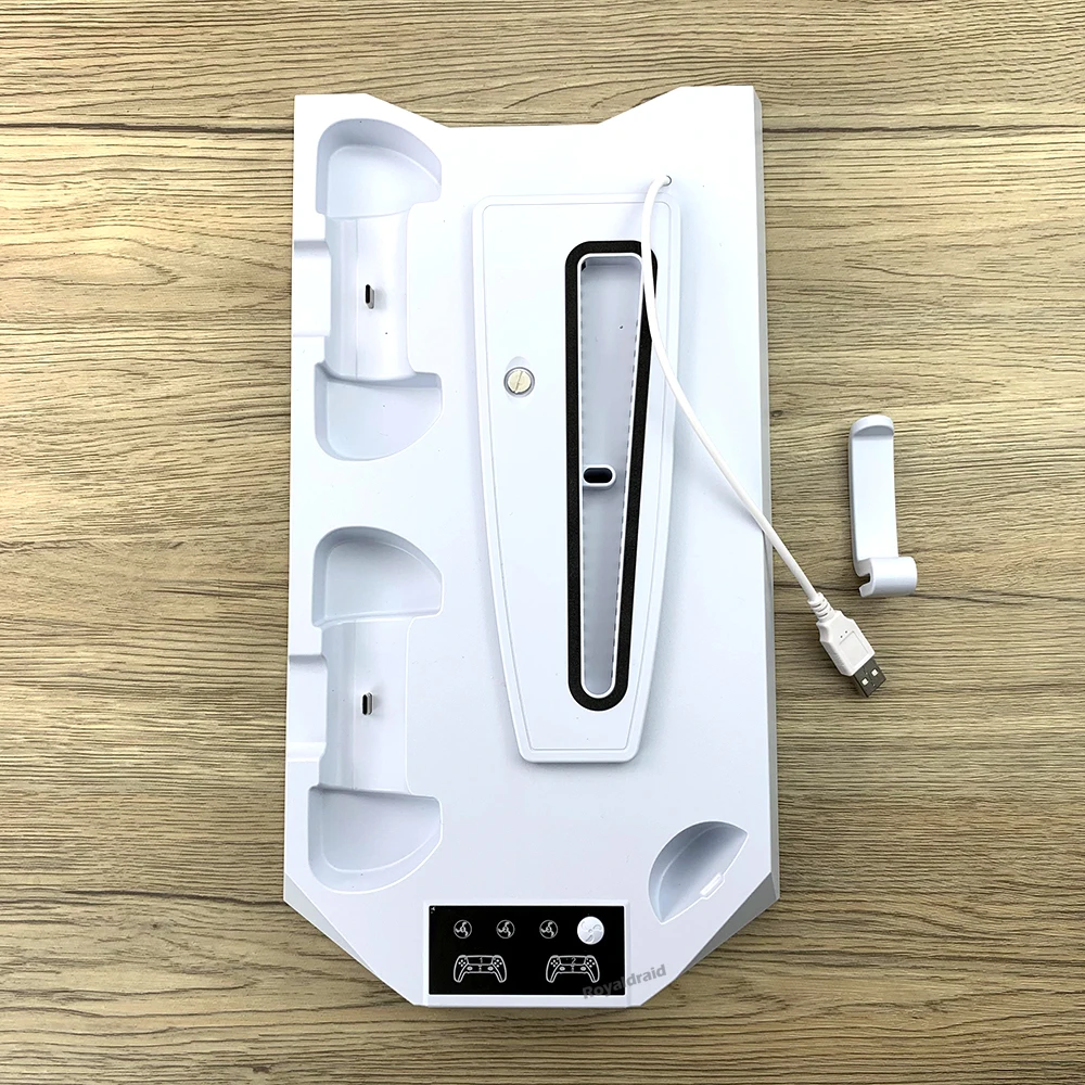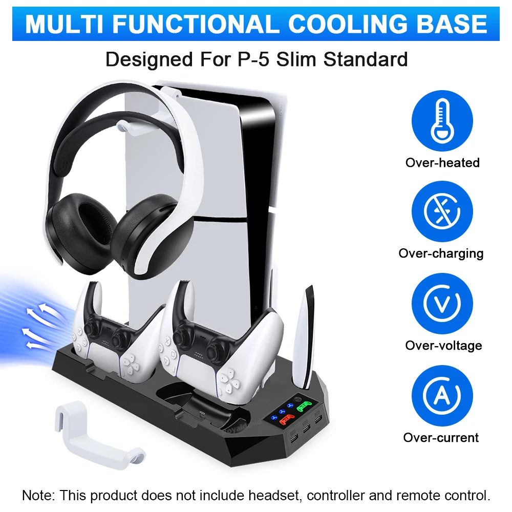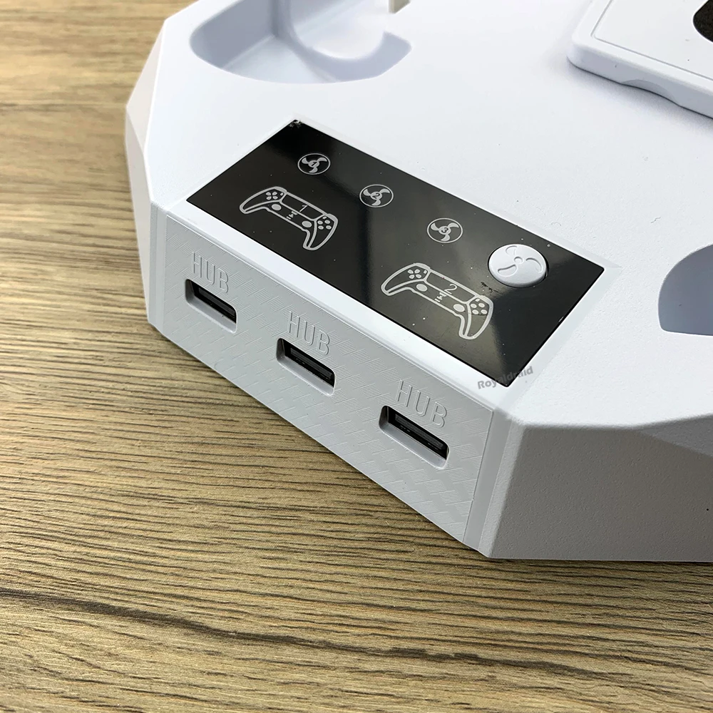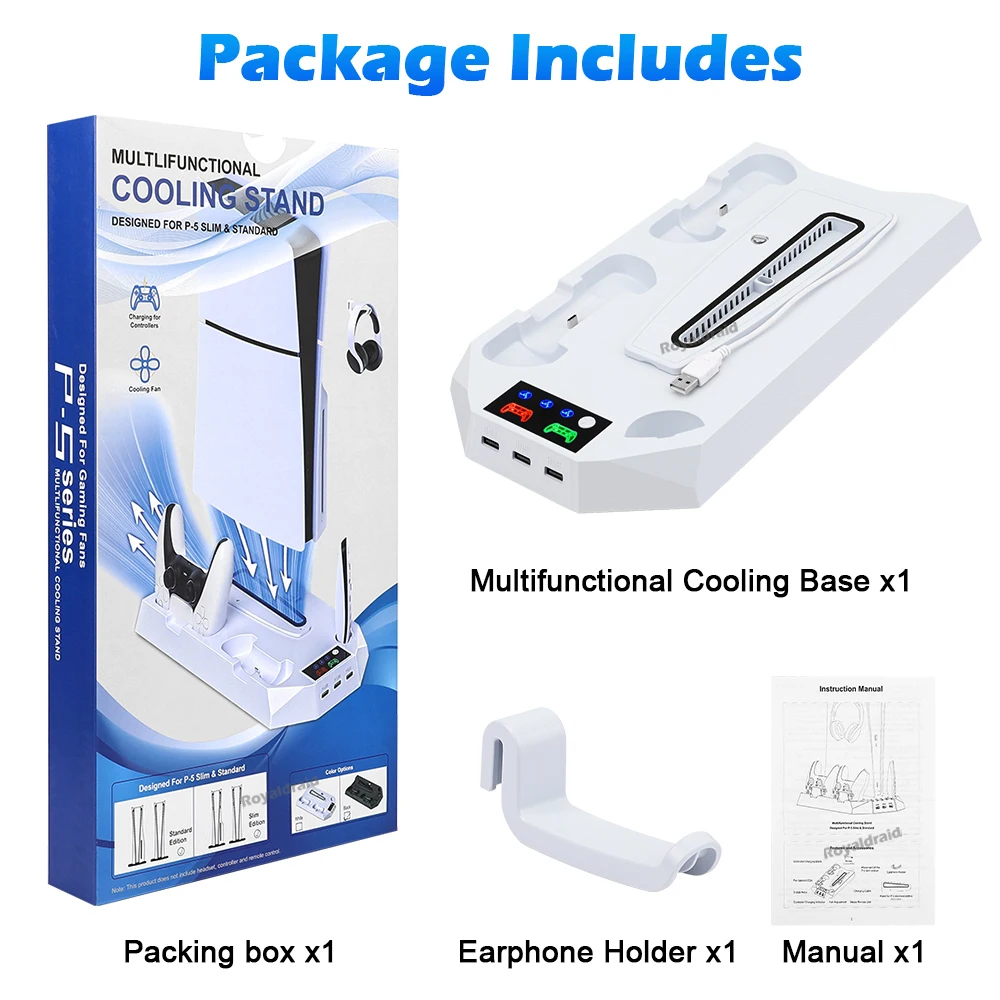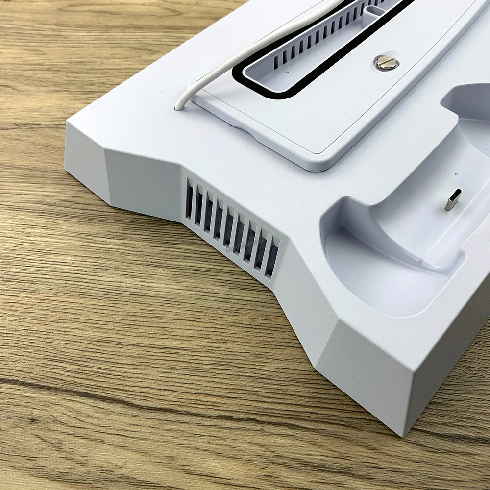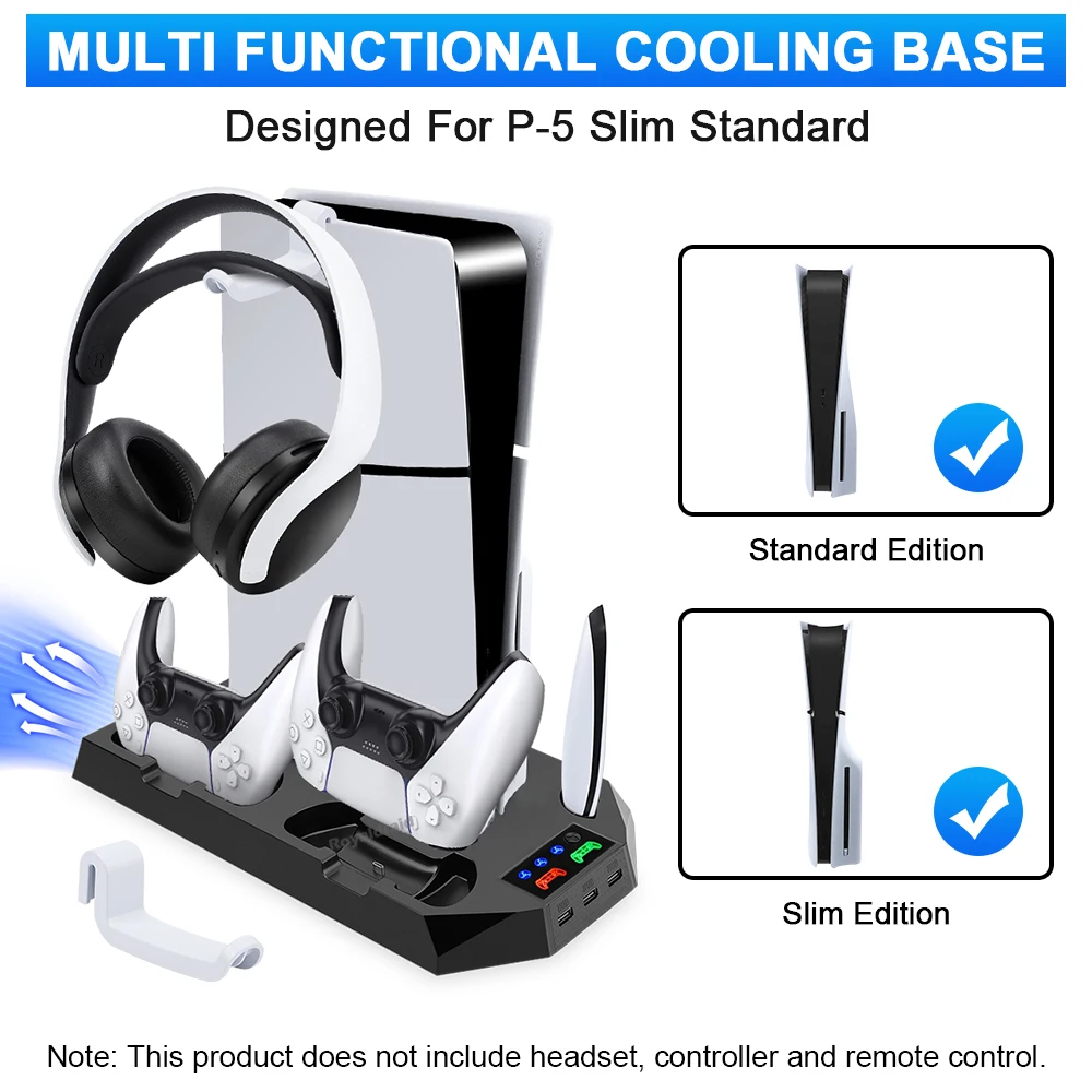 Este producto es adecuado para consolas P-5 Standard Digital Edition/ Standard Dis Edtion Slimm Digtal Edtion Sim Disc Edition.Tenga en cuenta el uso del Panel para la edición estándar P-5:Panel para edición estándar P-5 1.Para la consola de edición P-5 Slim, es necesario sacar el panel para la edición estándar P-5 2.Para la consola de edición estándar P-5, es necesario conservar y utilizar el panel. Nota importante 1.Si necesita continuar usando el producto después de apagar la consola P-5, debe configurar la consola P-5: abrir "Configuración - Sistema - Ahorro de energía -Características disponibles en modo de descanso -Fornece alimentación a puertos USB" y seleccione "3 Horas" o "Siempre". 2.Si utiliza un adaptador de cargador, asegúrese de que la potencia de salida del adaptador sea mayor que SV2A.(Se recomienda conectar al puerto USB en la parte posterior de la consola P-5) 3.Este producto se aplica al controlador DualSense y no se aplica al controlador P-5 DualSense Edge.Especificación:Aplicación: para consola PS5 y SlimColor blancoMaterial: ABSCorriente del ventilador: 230 mAVelocidad del ventilador: 1'' velocidad 3000+_200 RPMVelocidad del ventilador: 2'' velocidad 3600+_200 RPMVelocidad del ventilador: 1'' velocidad 4200+_200 RPMEspecificación del concentrador: USB2.0 *3Potencia de entrada: DC5V 2ACarga del controlador: DC5.1V 800mA*2El paquete incluye: