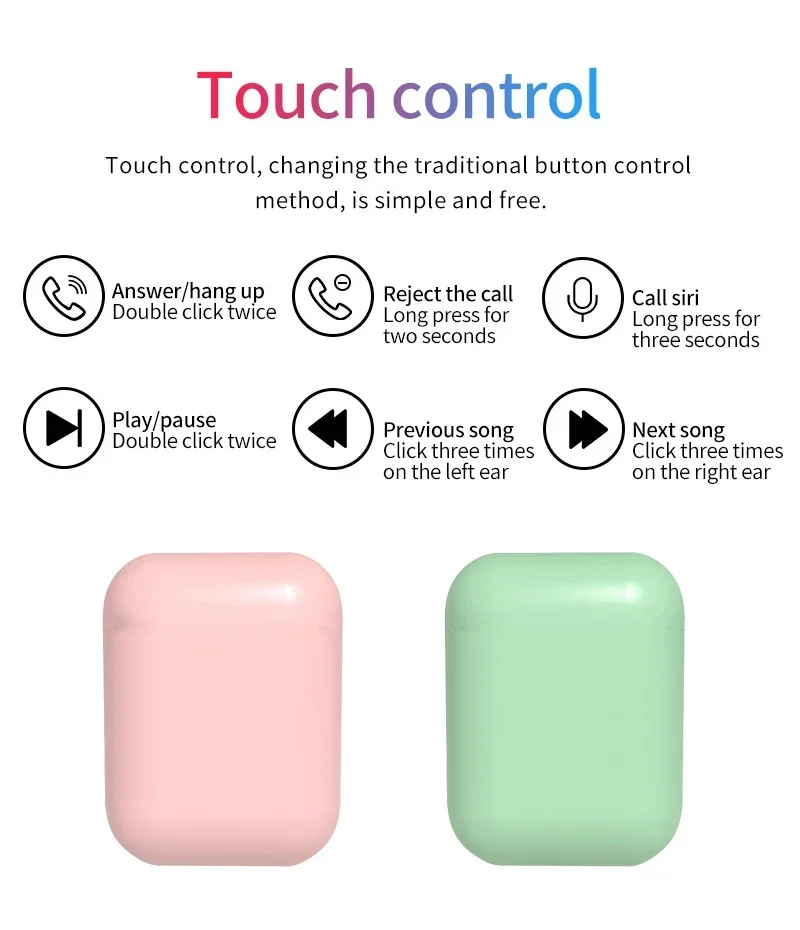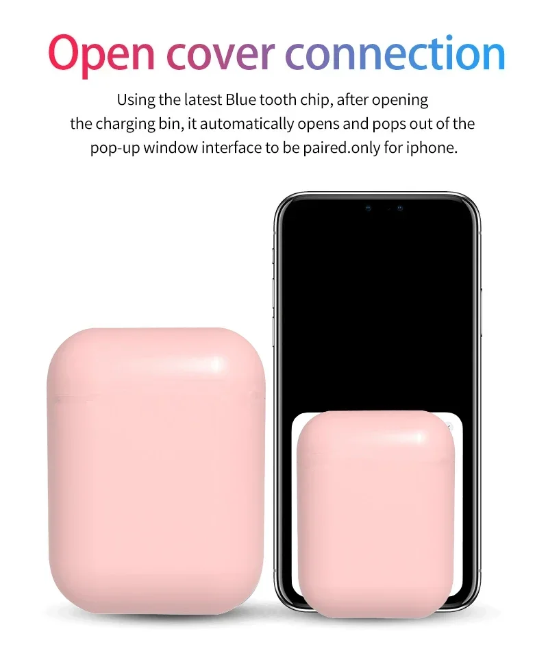 3.Empareje con el dispositivo: 1)active Bluetooth en el dispositivo 2)busque i12 y conéctese a i12 Especificación: 1.Controlador: 15 mm 2.Impedancia: 9 ohmios 3.Versión de Bluetooth: Bluetooth 5.0
